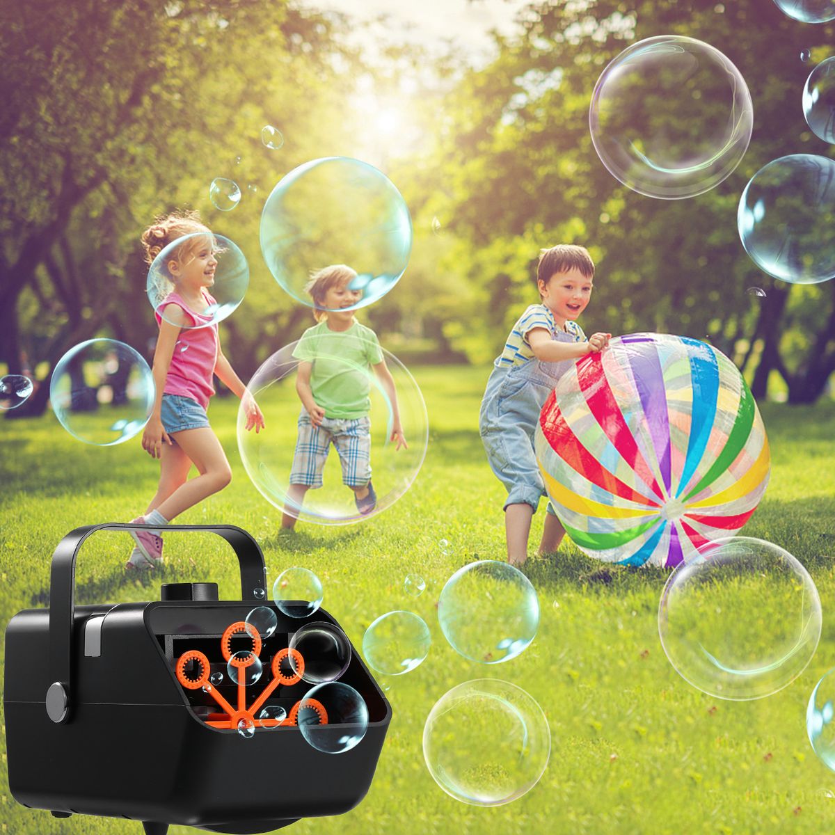 Easy to use, just add some bubble liquid into the tank and plug to power, turn on the machine, the bubbles will fly all over the air.