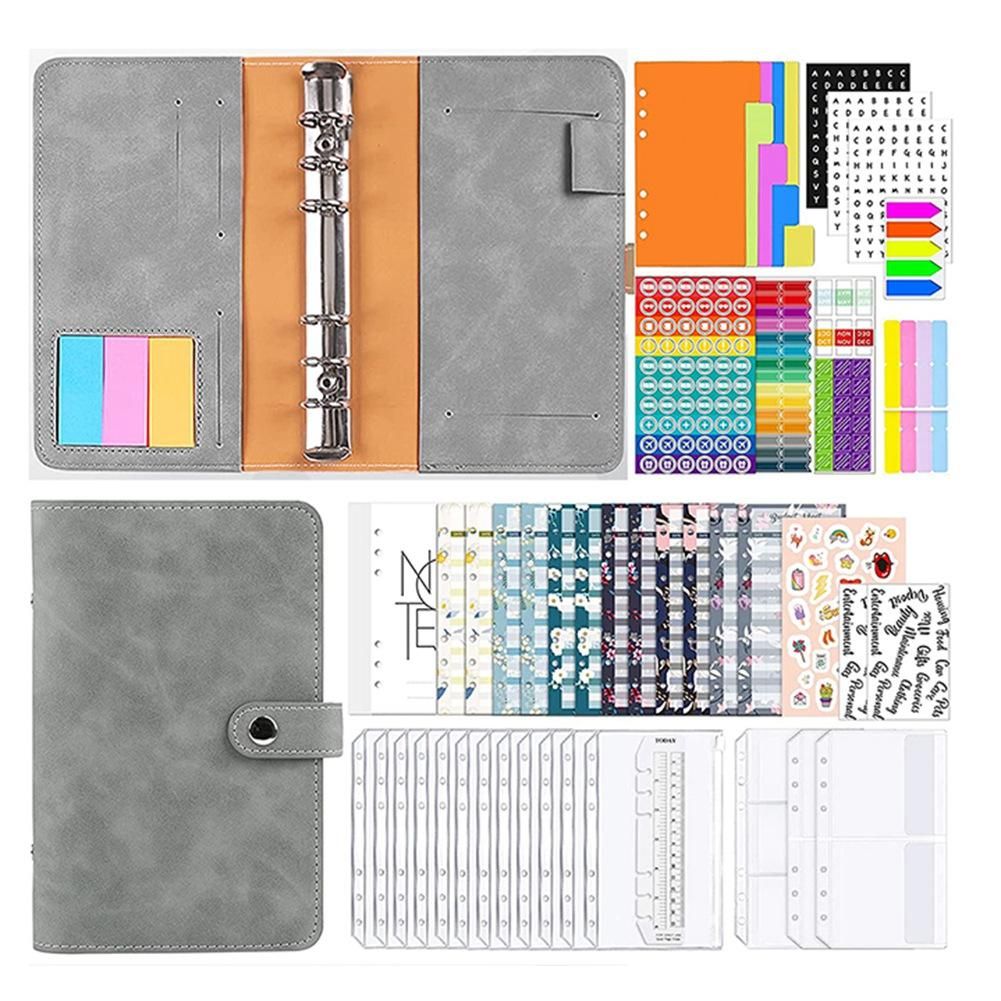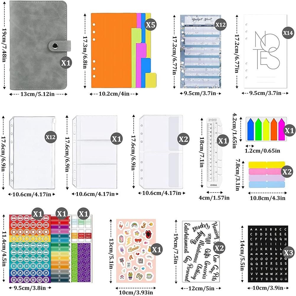 PU Leather Case x1,12 pieces A6 binder bags, 12 pieces A6 refill paper,1 clear card holder, 1 double pockets,14 Monthly Plan,1 ruler,2 x English stickers,5 color labels,1 cartoon sticker,2 sheets of adhesive tape 4 color sticky notes,3 sheets multifunctional label stickers,3 letter stickers,Lightweight and easy to carry, widely used at home, school, office and travel.