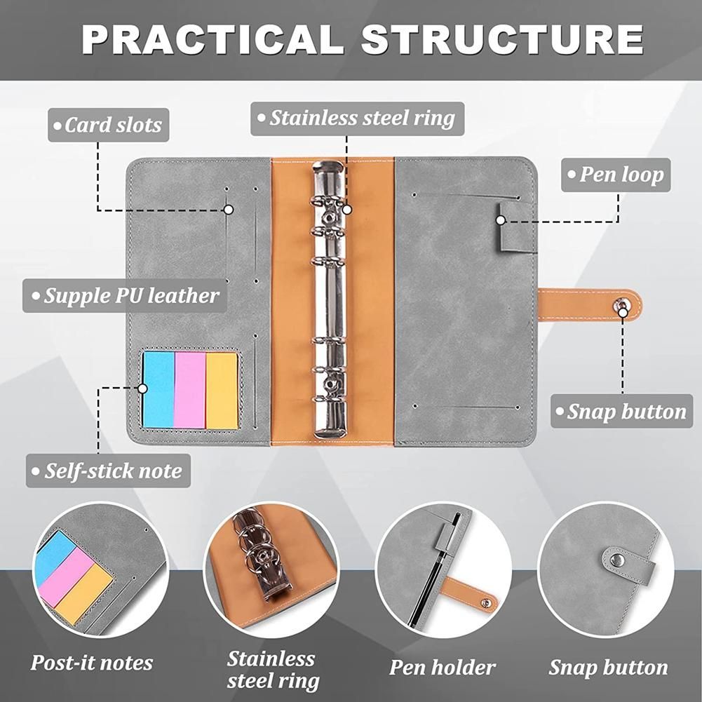 The binder is made of high-quality PU material, wear-resistant and not easy to damage, and has a comfortable touch. Compared with the transparent plastic loose-leaf cover, it can better protect your privacy. Card slots and compartments inside help you organize tickets, cards, etc. quickly. The pen holder can also fix your pen in a suitable position