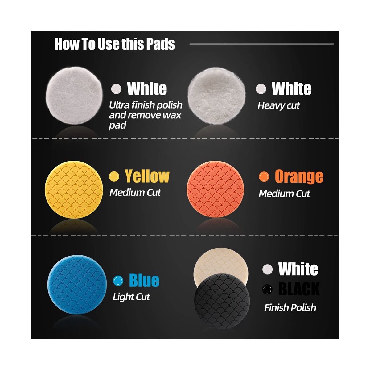 EASY TO USE - Can be used in pneumatic or electric polishing machine. Used for Auto car detail polishing. With abrasive stick backing, you can change the sponge. They are suggested to be washed with clean water and dried naturally after using.