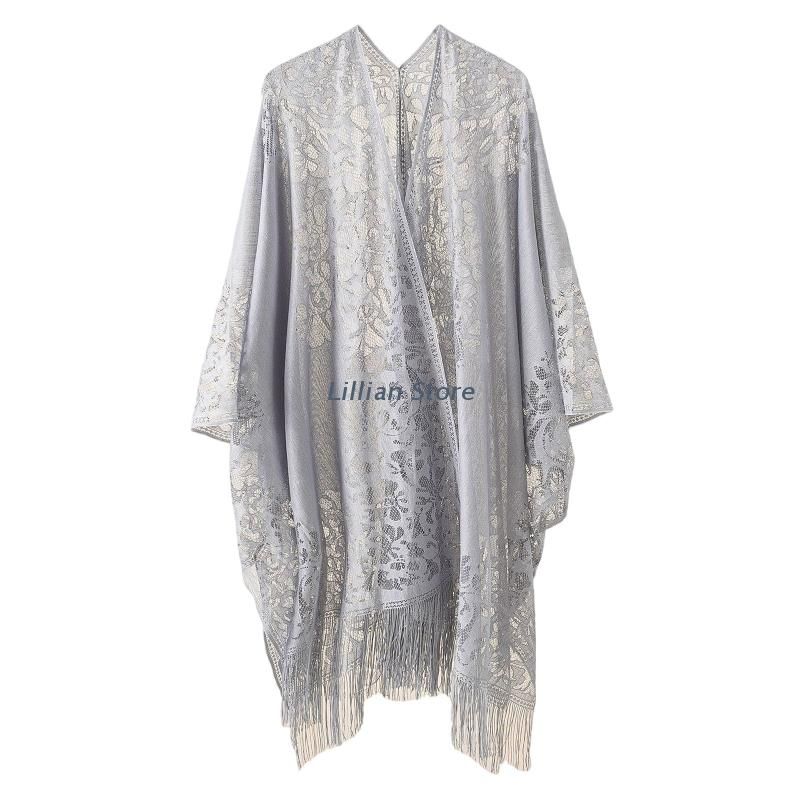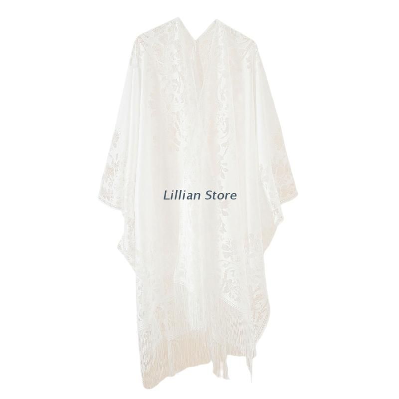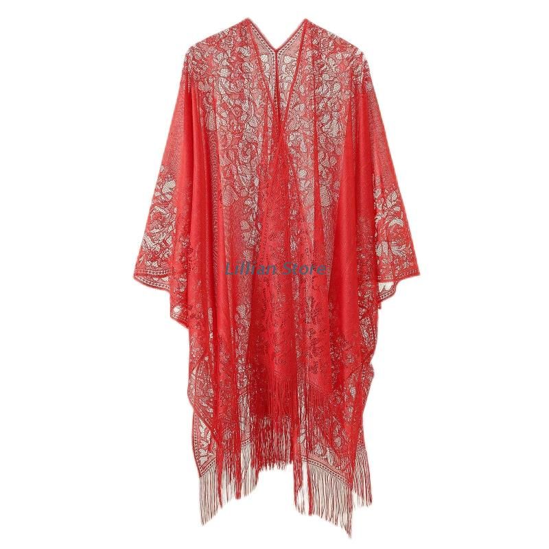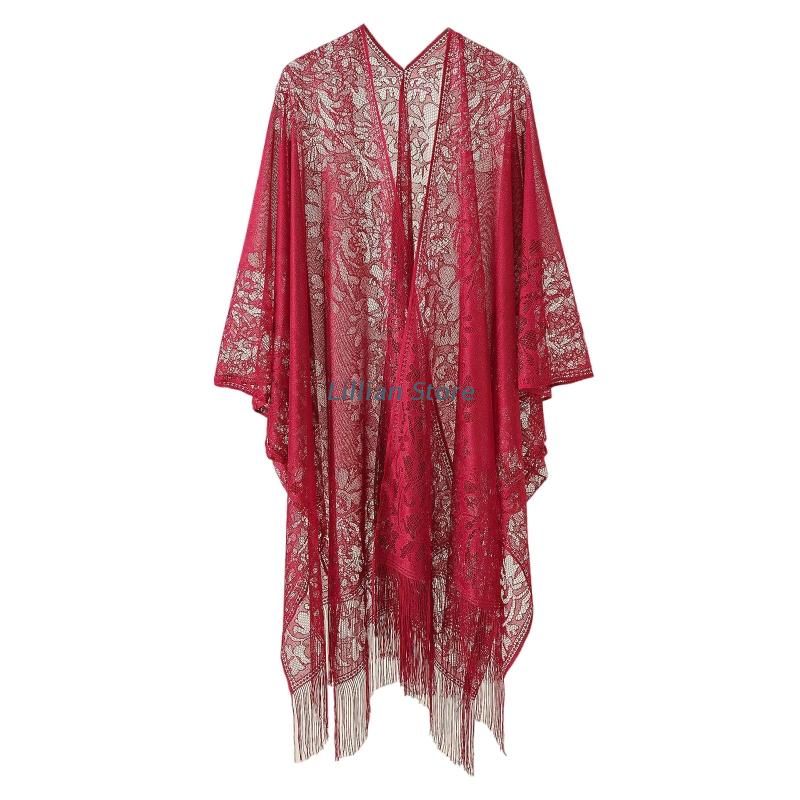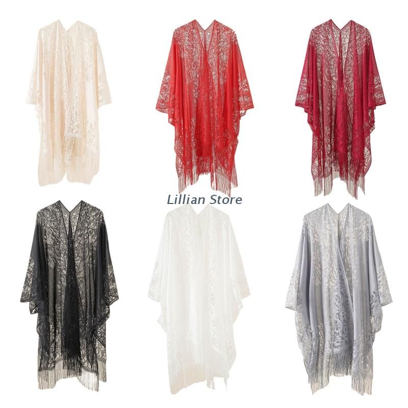 Women Summer Lace Bikini Swimsuit Cover Up Hollow Out Crochet Floral Fringe Tassels Open Front Cardigan Solid Color Oversize