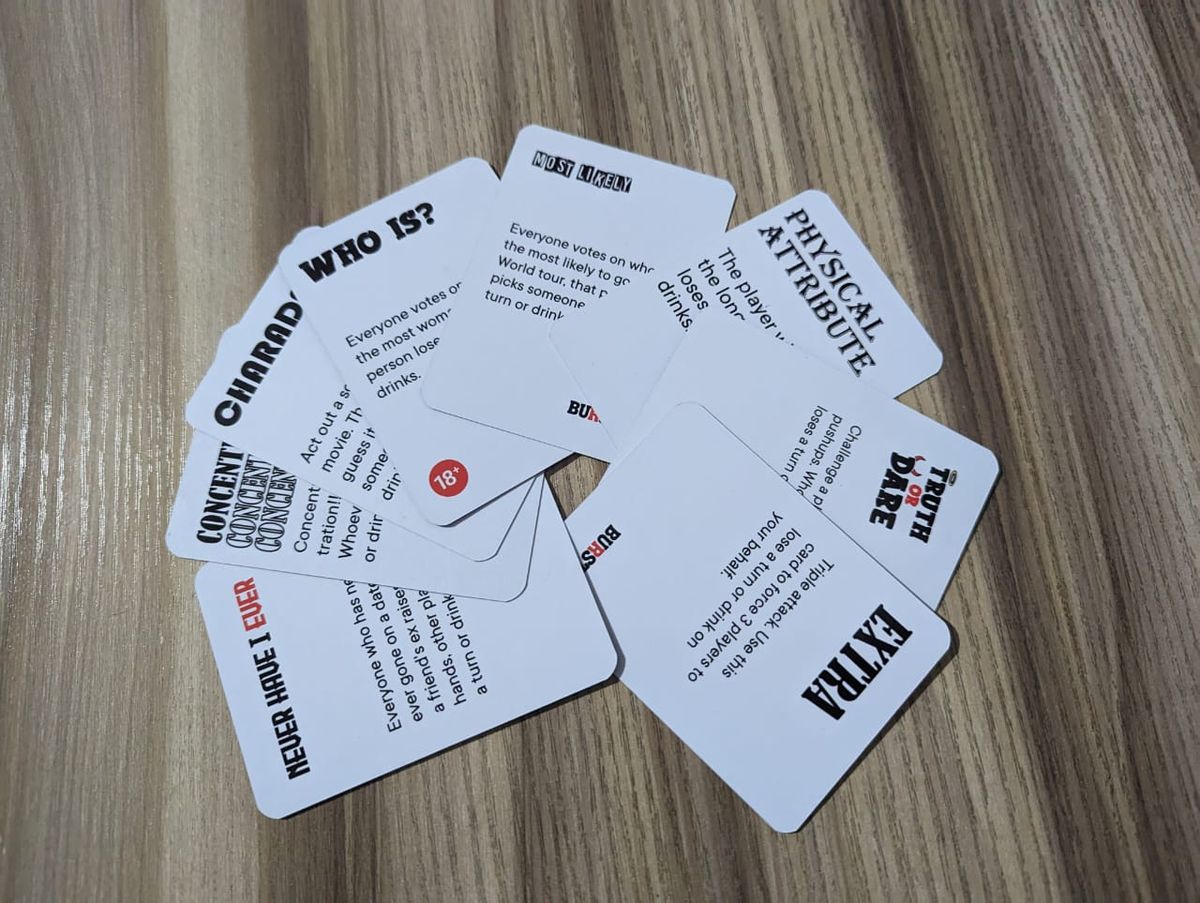 Bursted is a fun card game that can be played by both family and friends. It can either be a drinking game for parties or a non drinking game for regular hangouts. The rule of the game is for people to either lose a turn or drink. When they lose a turn, they get a letter from the BURSTED name until the name of the game is spelt completed (BURSTED from the game).