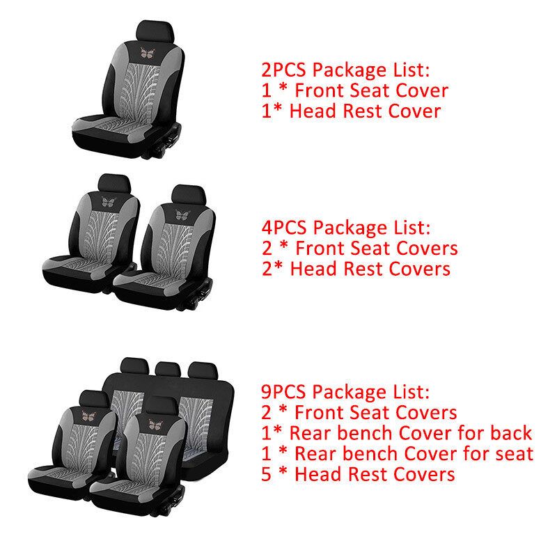2PCS(front row) Set Included: 1 x Separate Headrest Cover 1 x Front Seat Cover 4PCS(front row) Set Included: 2 x Separate Headrest Cover 2 x Front Seat Cover 9PCS(front and rear row) Set Included: 5 x Separate Headrest Cover 2 x Front Seat Cover 1 x Rear Bench Seat Cover 1 x Rear Backrest Seat Cover