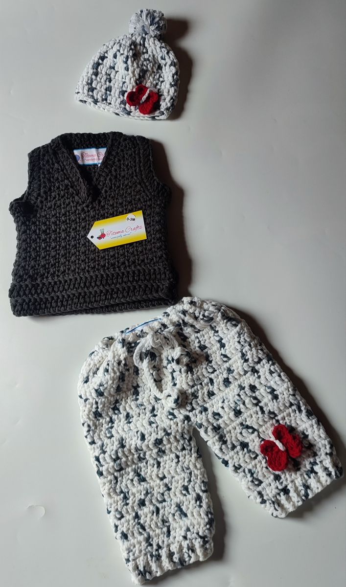 Set Consists of a crochet vest, sweat pant trouser and beanie hat