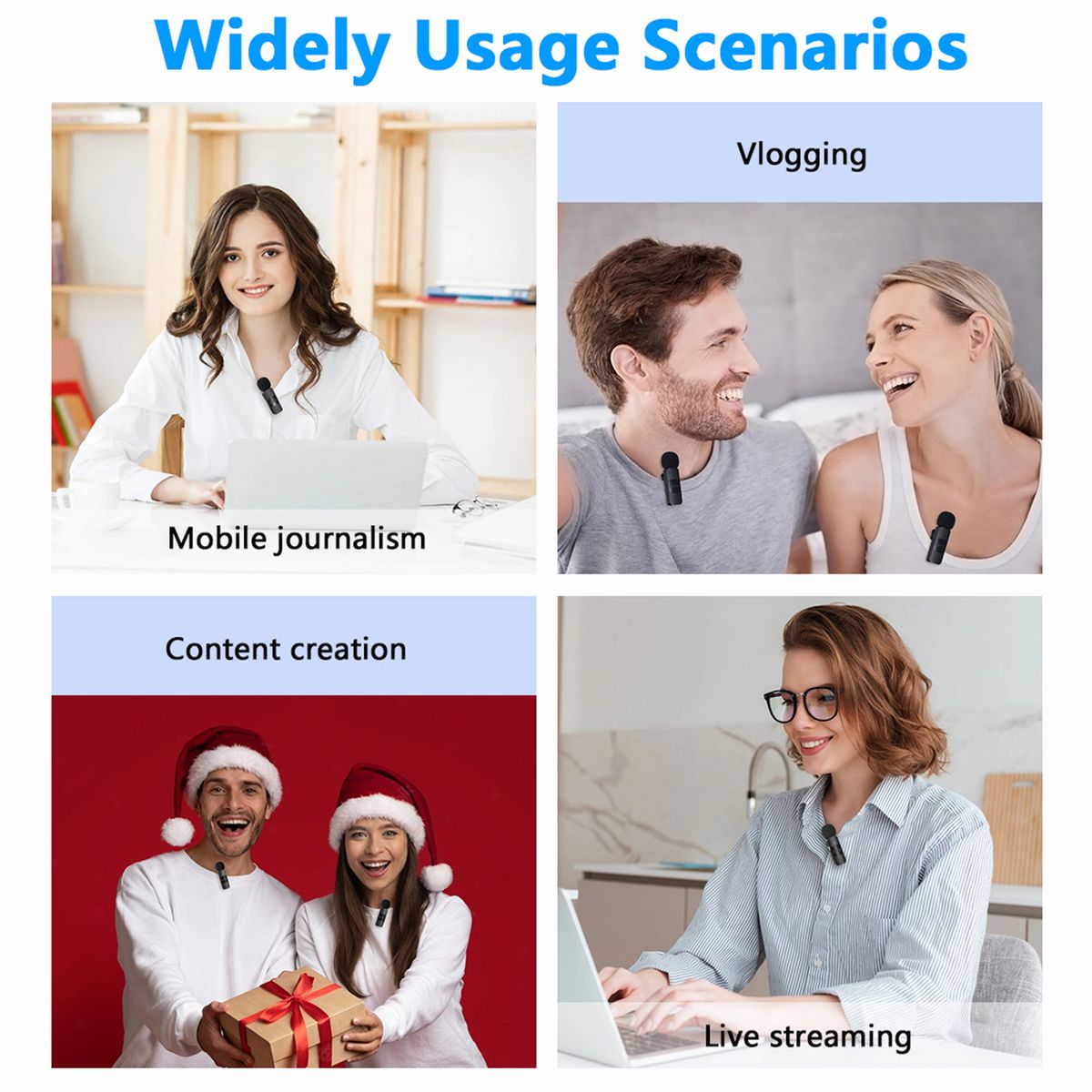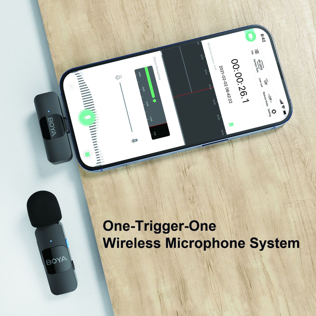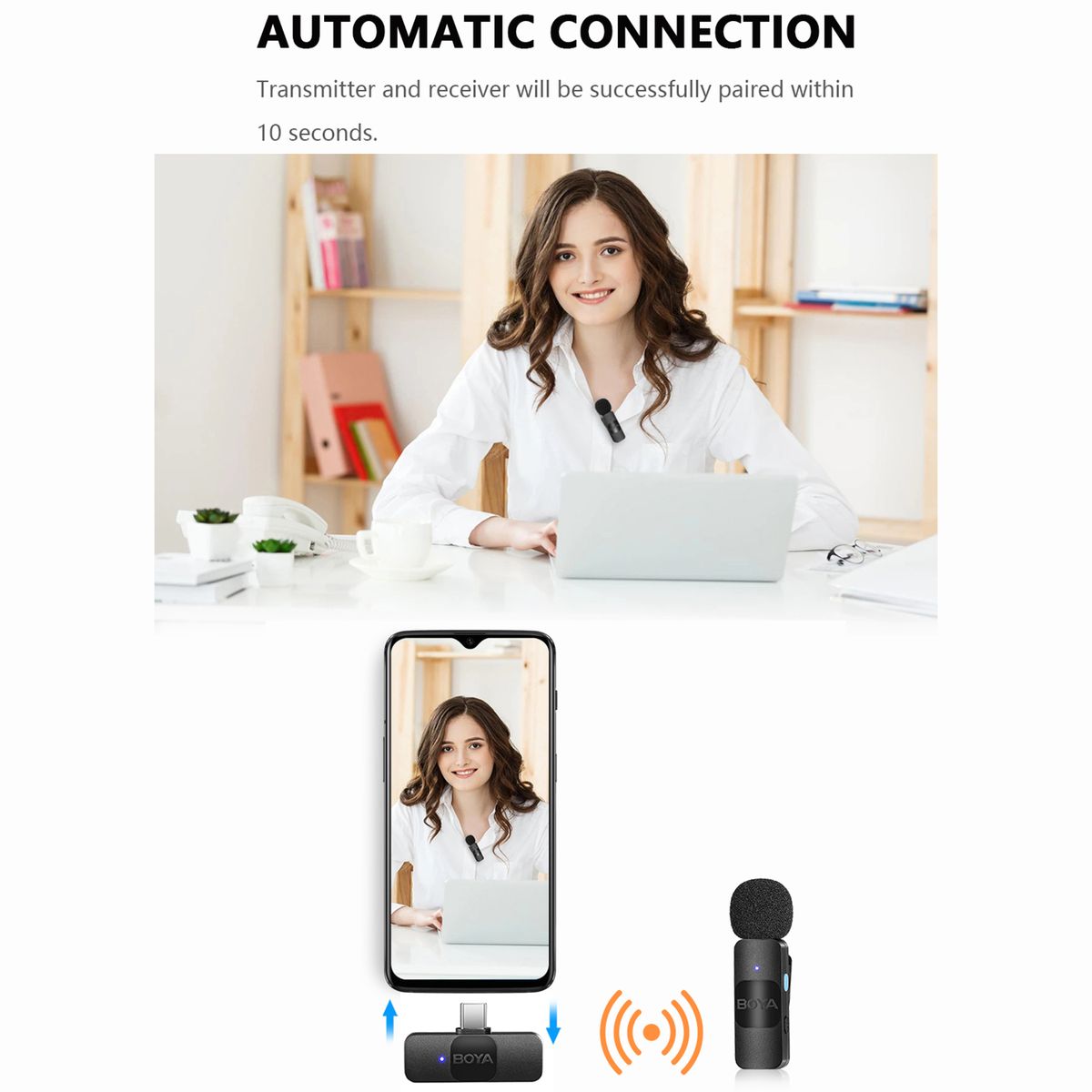 Wireless Microphone System This wireless microphone system adopts 2.4G wireless transmission technology, supports auto pairing, plug-and-play, no APP needed, very suitable for phone vlog, live streaming, interview, online chatting, etc.