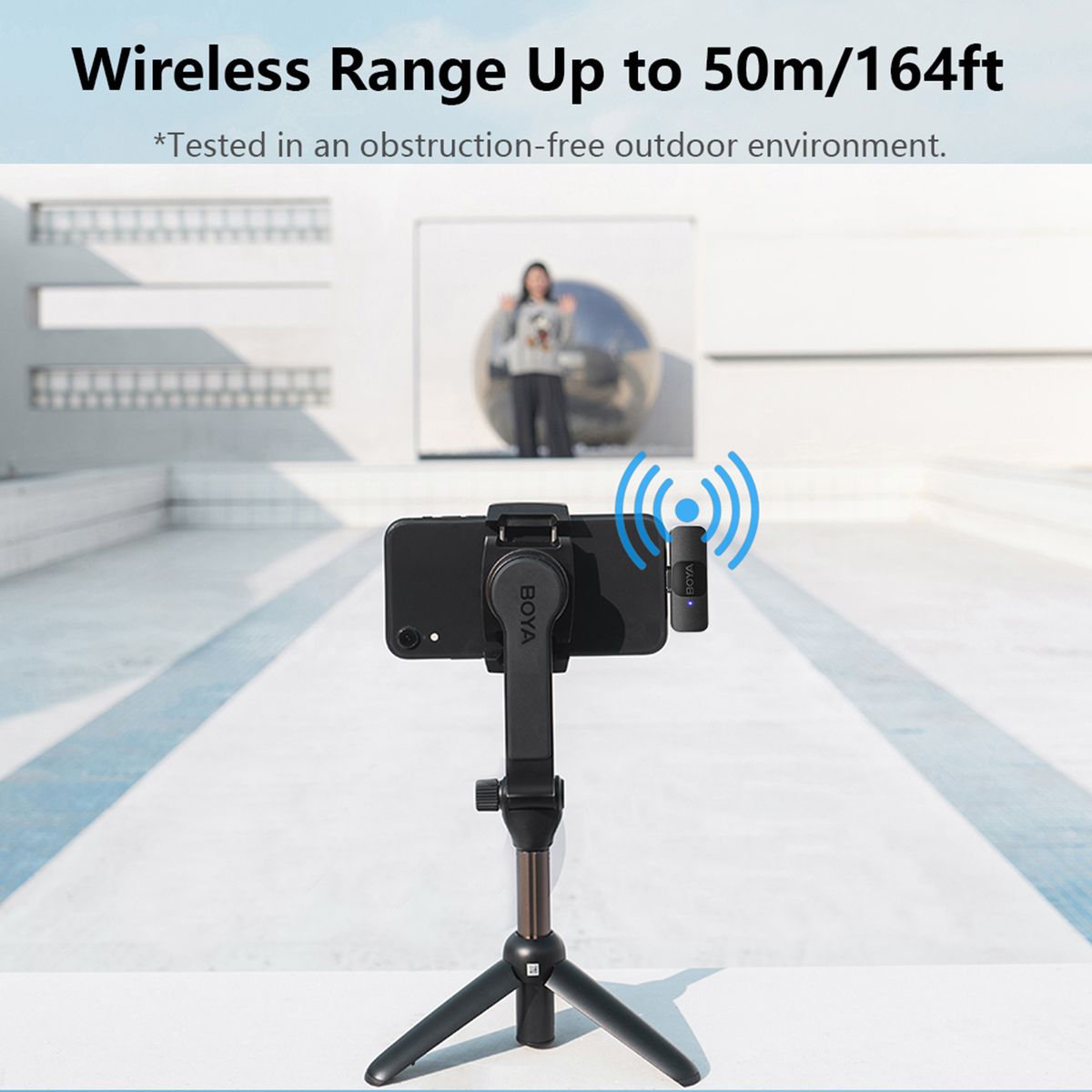 Long Distance and Clear Transmission Up to 50M effective transmission helps you to realize long-distance recording easily. Built-in smart noise reduction module, the wireless microphone can effectively filter out the noise to improve sound quality by turning on the NR function.