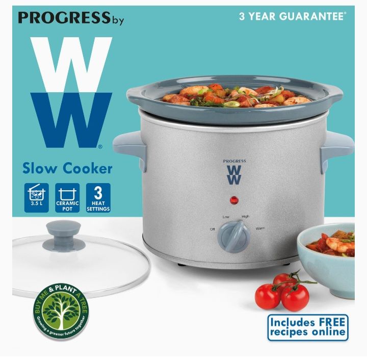 Perfect for curries, stews, risottos and cooked oats, this Slow Cooker from Progress by WW is a versatile addition to your kitchen. Easily batch cook/meal prep delicious meals with the generous 3.5 litre capacity. With a removable ceramic cooking pot for easy cleaning after use, the Slow Cooker has 3 heat settings; low, high and keep warm to suit your recipe. Featuring cool touch handles, a tempered glass lid and power/ready indicator lights, the Slow Cooker has all you need to make tasty meals.