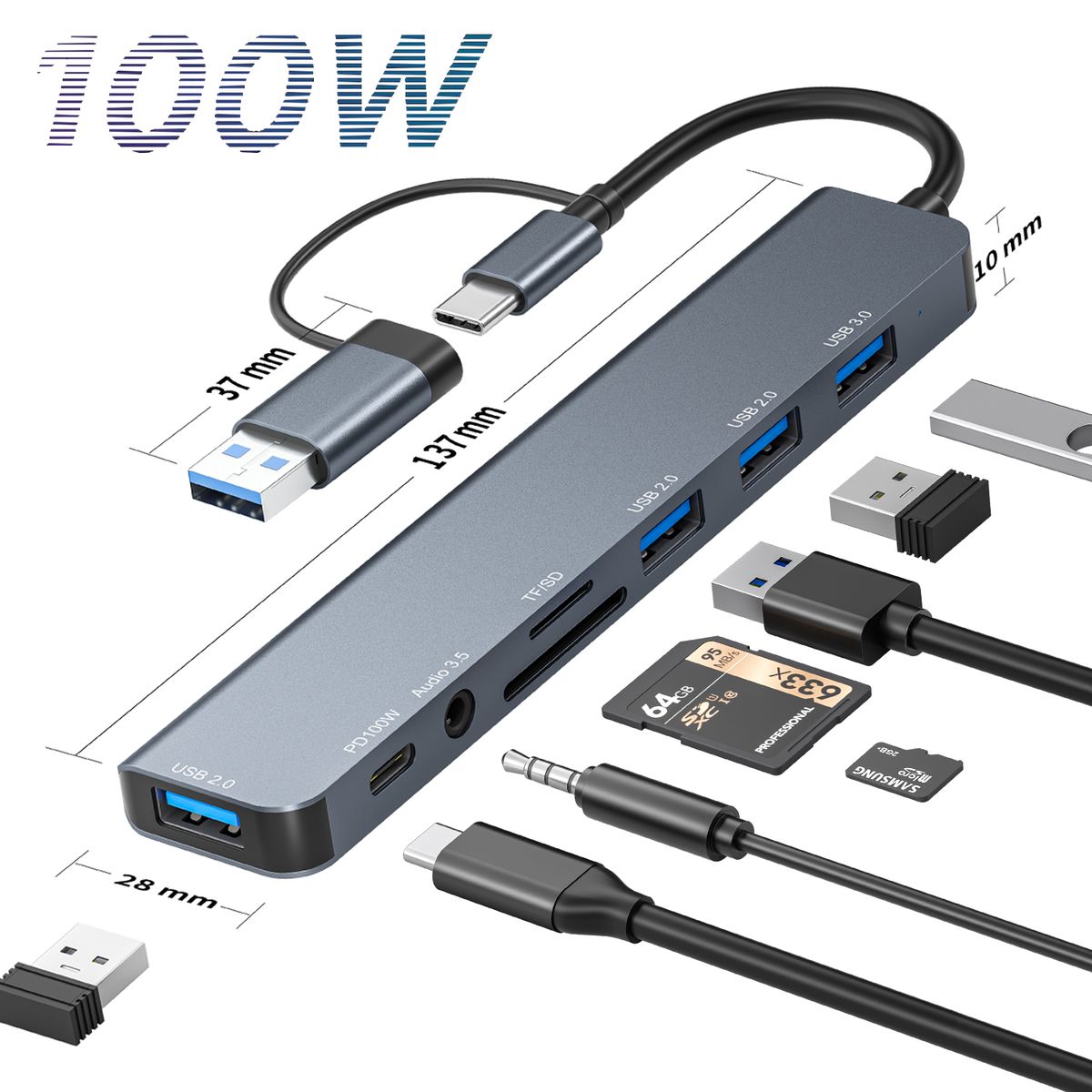 USB-C HUBMultifunction Adapter1.USB C Female port1:PD-20V 5A.Support Max 100W Power Adapter(Input)2.USB*4:5Gbps and is downward compatible withUSB2.0 and USB1.13.SD/TF Card Reader:Support multiple types of TF and SD cardsSD card andTF cardcannot used at the same time.4.Audio 3.5mm:3.5mmAudiointerface:Connect audio devices suchas headphones and microHow to use: first plug the docking station into the computer,thenconnect the peripheral deviceOperating voltage: 5VStatic current: 5V 40MAOperating Current:40-150MA