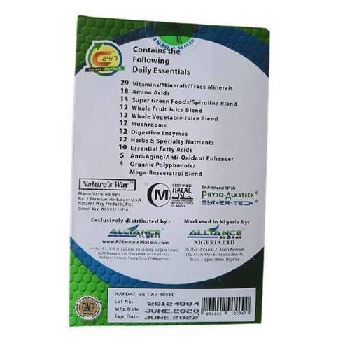 Composed of a greater number of revitalizing nutrients from more natural sources than any product, C247 supplements are the Whole Food Energizers and world's most potent anti-cancer food supplement. Is it worldwide approved? Yes, it is HALAL certified. Is it NAFDAC certified? Yes