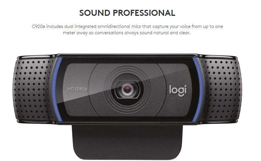 C920e includes dual integrated omnidirectional mics that capture your voice from up to one meter away so conversations always sound natural and clear.