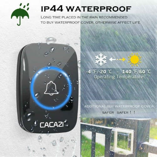 Completely wireless operation - no wires or cables required.Water proof and easy to fit.Choose your favorite sound from the different available melodies by pressing the button at the side of the door bellEasy to install by mounting the remote controller on smooth surfaces with the help of the double-side sticker at its back.Flash light on when visitor is pressing the remote button