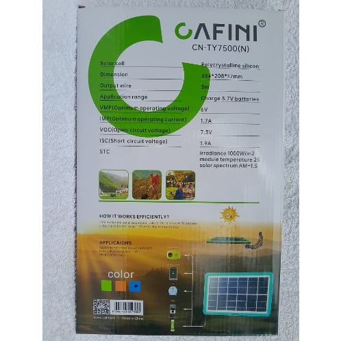 DescriptionThe LED light makes use of the built-in solar panel to absorb sunlight and change the sunlight into electricity power to recharge the built-in rechargeable battery to give off bright lightThe LED light is charged by sunlight during the daytime.With built-in Power bank USB Out to charge cellphones & comes with a 10 in 1 charging cableMain panel with built in 6 SMD LED LightFeatures2 way charging-AC 230V Power adapter and or Solar EnergyPortable & Lightweight & dimension of 117mm x 63 mm x 170 (Height x Depth x width)Shell material: durable hard plastic.Comes with a 10 in 1 USB Charging cable100% brand new and high quality Solar Powered Super Bright LED LampsLight source: White SMD LED bulbLarge 3.5 Watts solar panel with 2 Meter cable to absorb the sunlight and transform the sunlight into electricity to recharge the built-in battery.External solar panel 225mm x 140mmBuilt in Power Bank USB Out for charging DV, MP3, MP4, PSP, iPod,low power cellphones such as Galaxy Note,Blackberry 8520 etc except high powered devices such as iphone & TabletsHeadlight Lamp for emergency serch & rescueSpecificationsMonocrystalline Solar panel: 3.5W, 9Volts 0.38ABuilt-in 6 SMD LED Light6V4Ah rechargeable sealed lead-acid batteryExternal Bulb Light source: 6V 3Watts SMD LED bulb.AC 220-240V, 50/60Hz - A/C Charging time 3 hours3.5W Solar Panel - Charging time 12 hours in sunny weatherLighting time: about 10-14 hours.USB Out:5V 500mALuminous flux: 240LM.Package contents;Solar Panel -1PcLED Bulb with cable-3 Pcs