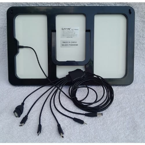 Package Include (1 power box, 1 power adapter, 1solar panel charger, 3 x 5W Led bulbs, 1 multi - USB cable)