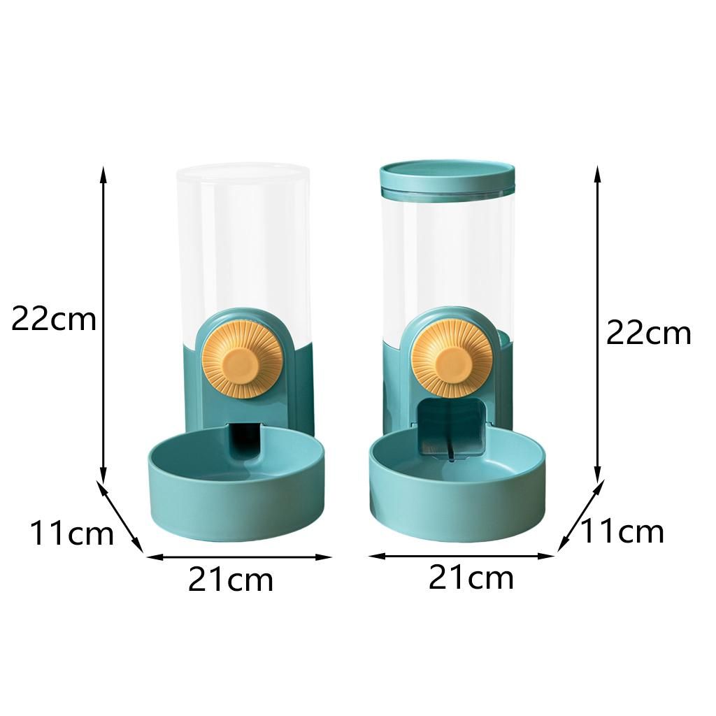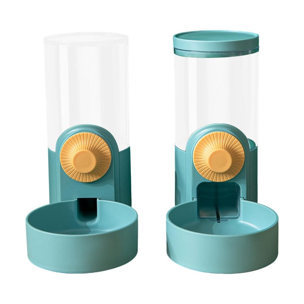 Pet food feeder and water dispenser set . Bowls with 4.7'' in diameter are perfect size for small animals, such as rabbit, chinchilla, guinea pig, hedgehog, and ferret etc.Automatic food feeder and waterer can be either placed on the ground or hung on the cage. Rotary knobs allow you to hang them tightly on the cage. A flat bottom also allows them to be put on the ground.Pets feeder set effectively reduce the frequency of food and water refills. Gravity feeding technology does all the work for you. They dispense food and water as your pets empty the bowls.These dog food dispensers are made of pp material, which can be washed at high temperatures.The gravity feeder has a larger opening with a reasonable slope so that the grain can be delievered smoothly into the bowl. there is a twisting lock on the water dispenser which allows you to place the water bottle tightly, so that there won't be any leaking.