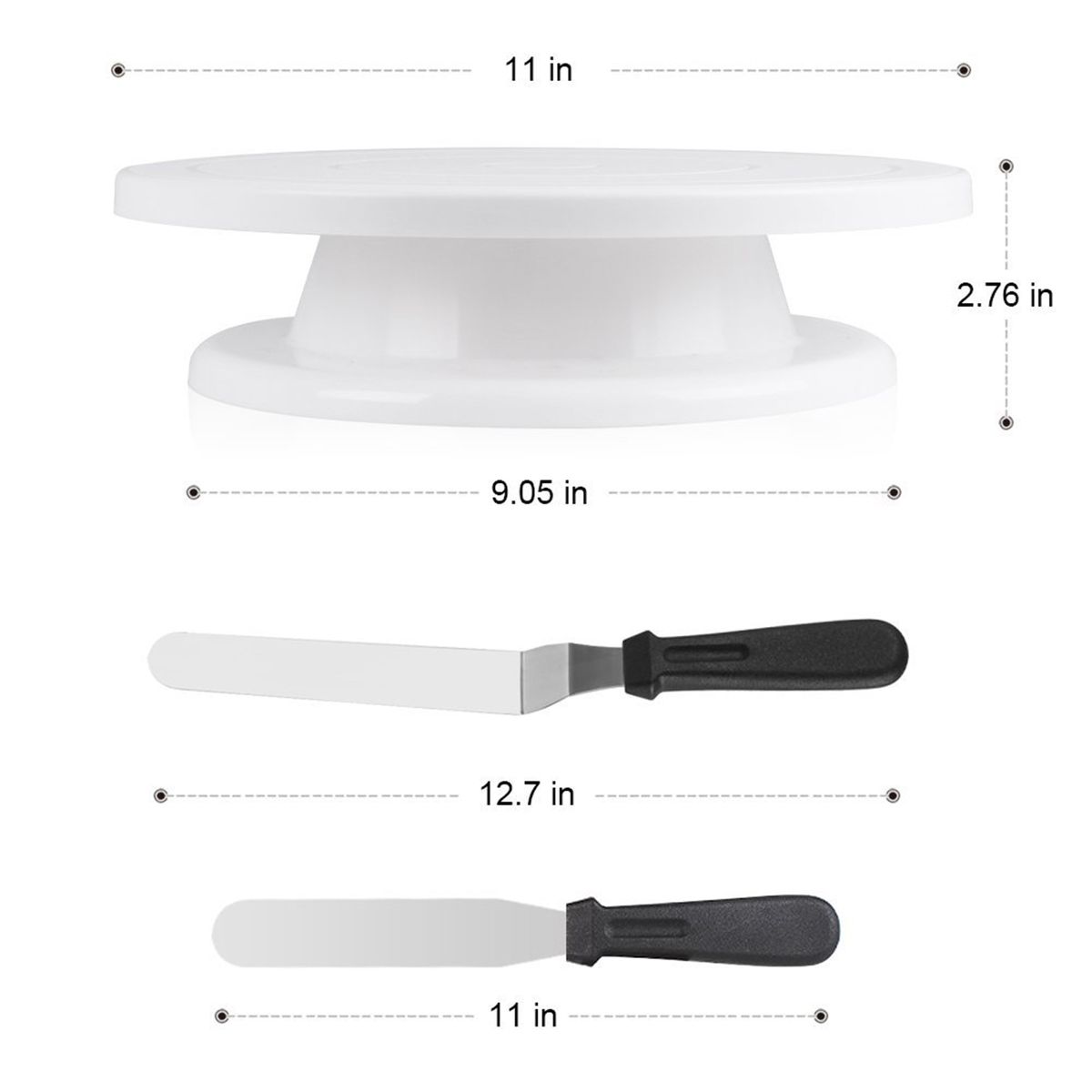 Size: Cake Turntable: Bottom Diameter: 9.05in, Top Diameter: 11in, Height: 2.76in;