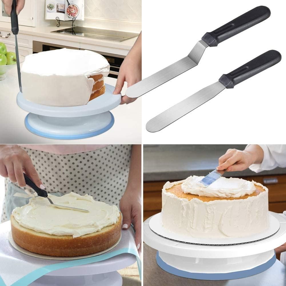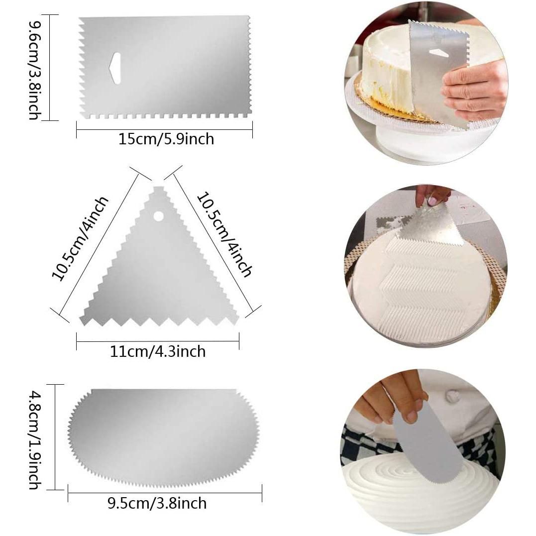 [Cake Spatula & Scraper] Icing smoother and cake scraper are essential tools to help you create designs on the side or top of cakes. 2 stainless steel icing spatula is perfect for making layered cakes and spreading on a crumb layer evenly and smooth. Use 3 scrapers set to smooth icing on sides & top and carve designs.
