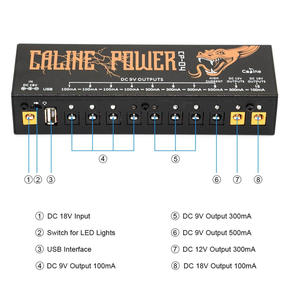 5、OUTPUT 8: Also 9V output with the maximum volume of 500mA,is suitable for digital effectors and 9V digital guitar amplifiers.When instantaneous over current occurs in this ,the corresponding LED light would be flashing and the current limit to 500mA.
