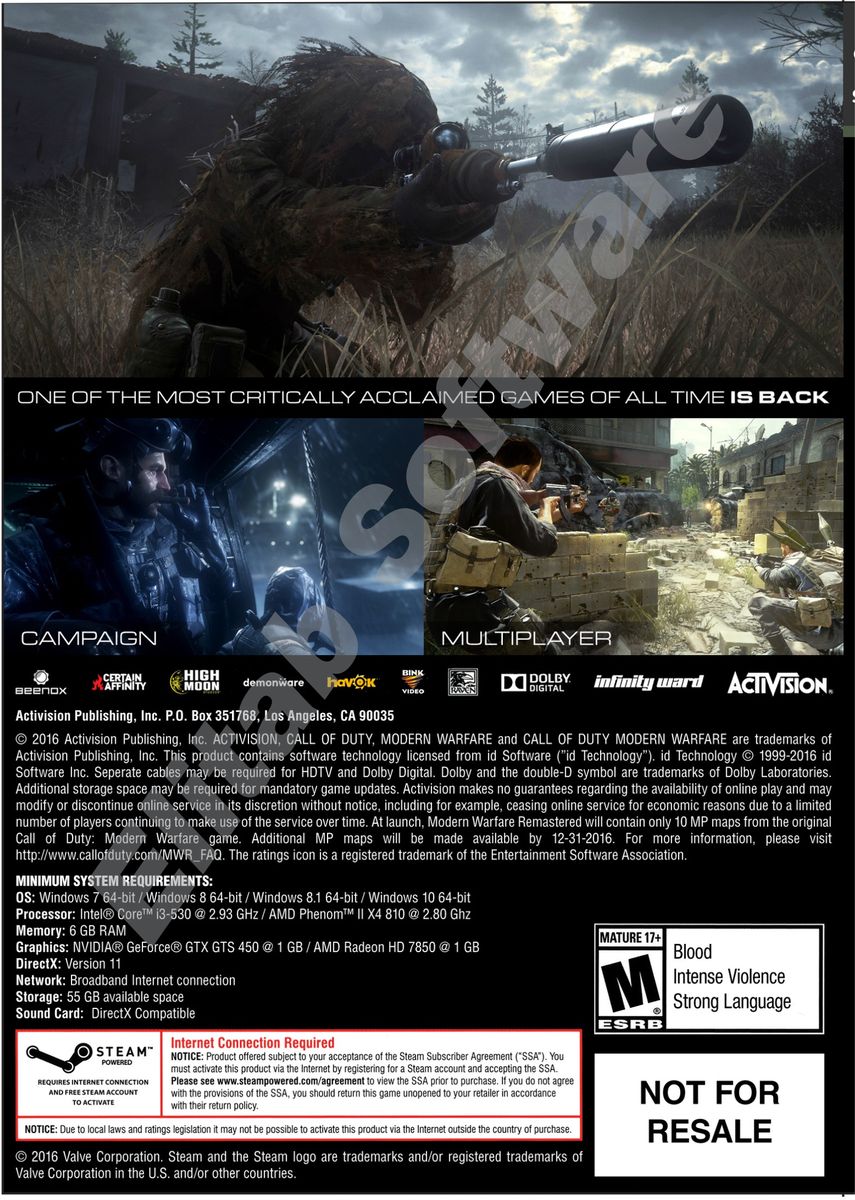<b>Call of Duty Modern Warfare Remastered PC System Requirements (Minimum)</b>OS Windows 7 64-Bit / Windows 8 64-Bit / Windows 8.1 64-Bit / Windows 10 64-bitProcessor Intel Core i3-530 @ 2.93 GHz / AMD Phenom II X4 810 @ 2.80 GHzMemory 6GB RAMGraphics NVIDIA GeForce GTS 450 @ 1GB / ATI Radeon HD 7850 @ 1GBDirectX Version 11Network Broadband internet connectionHard drive 55GB available space at launch (more space will be required for updates, DLC, etc.)Sound Card DirectX-compatible |