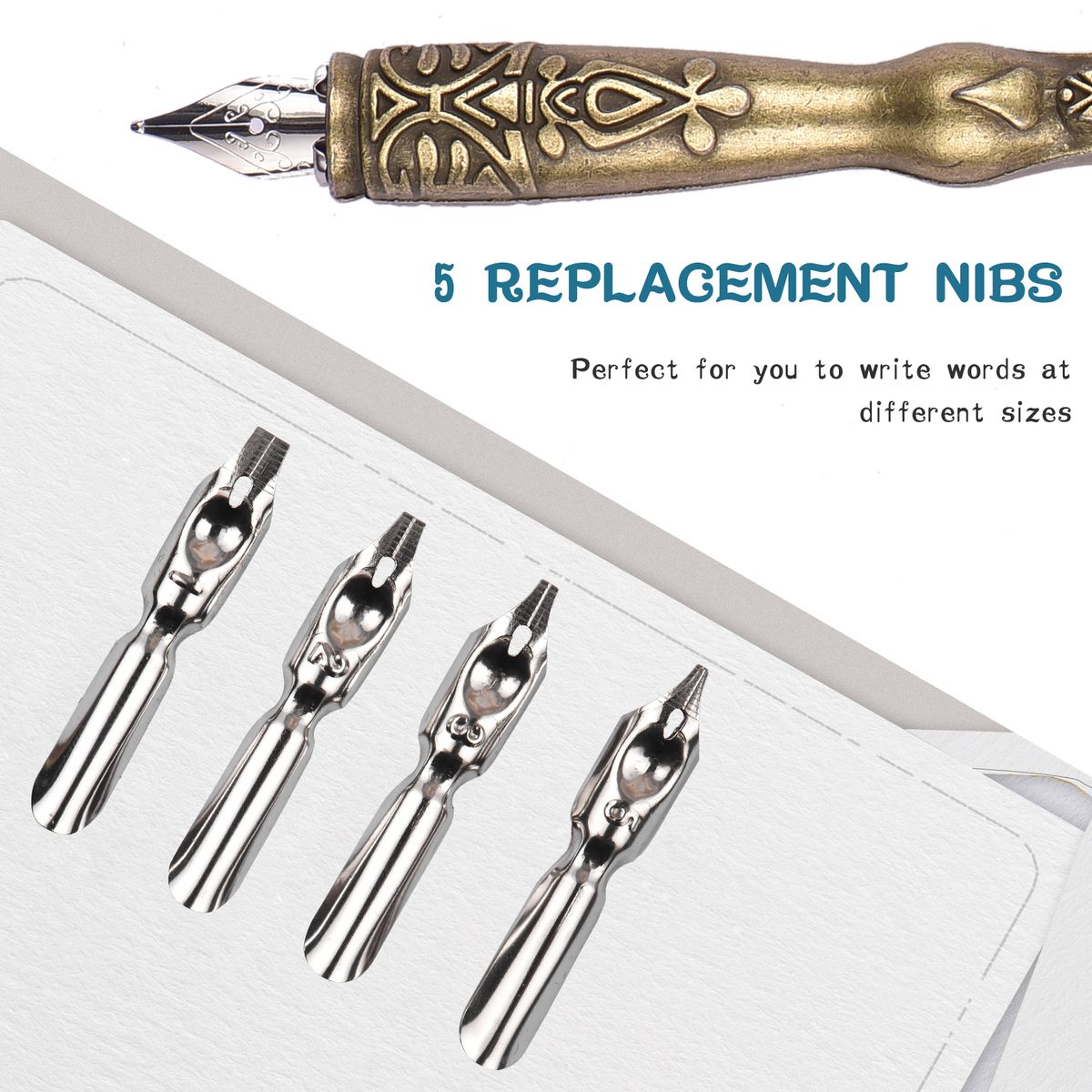 The quill pen and ink set comes with 5 replacement nibs, perfect for you to write words at different sizes.