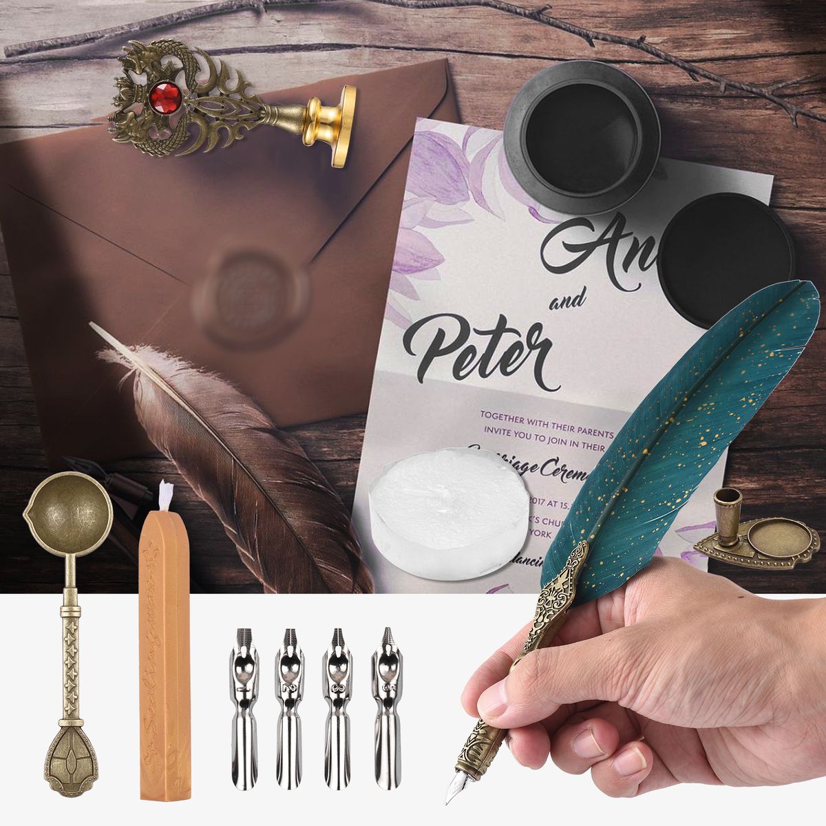 Package including quill pen, 5 replaceable nibs, ink, pen holder, stamp, spoon, wax stick, wax candle.