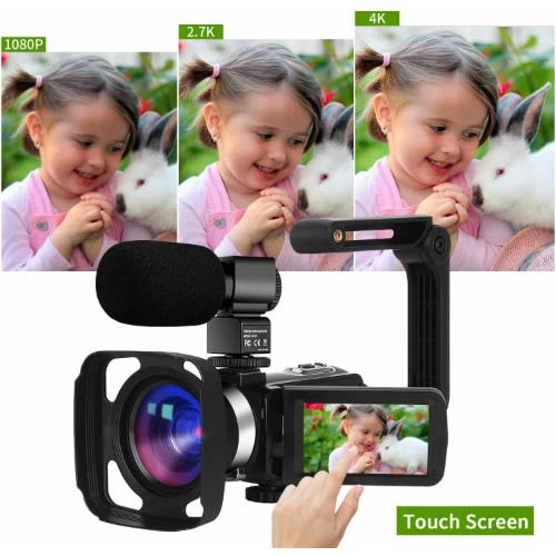 About this itemUltra HD 4K Camcorder This video camera max supports 4K (2880*2160) video resolution, 48.0MP image resolution, 16X digital zoom. Comparing with the traditional 1080P video, it is much clearer. Due to the 13M Pixel sensor, it delivers true-to-life HD video and natural colors even in low light conditions.External Mic & Webcam FunctionThis camcorder is designed with a hot shoe interface and it comes with a external microphone that can be used to install an external microphone if required. It can effectively improve the clarity of the recording and reduce noise. This video camera can be used as a webcam when you make video calls with family or friends. By connecting the computer with a USB cable, then choose the & ldquo;PC CAM & rdquo; mode as a webcam.Remote Control & HDMI OutputThis digital video camera comes with a remote control, within a range of five meters, you can remotely control the camera to take pictures and record videos. you will never miss a group photo again. In addition, you can use HDMI cable to connect it directly to HDTV and play your HD video. It's the ideal microphone camcorder for bloggers and video enthusiasts!Multifunctional CamcorderThe vlogging camera for youtube has 3.0" IPS touch screen and supports 270 & deg; rotating .This camcorders also features anti-shaking, built-in fill light, recording while charging, beauty function,and more. This video cameras is perfect for recording the beautiful moments of your life.This camcorder come with 2 rechargeable batteries and it can record video while charging, you can record a long enough video as needed without worrying about the battery draining. The video camera supports up to 128GB high speed class 10 SD/HCSD card(The SD card is not included in the package).Product Description