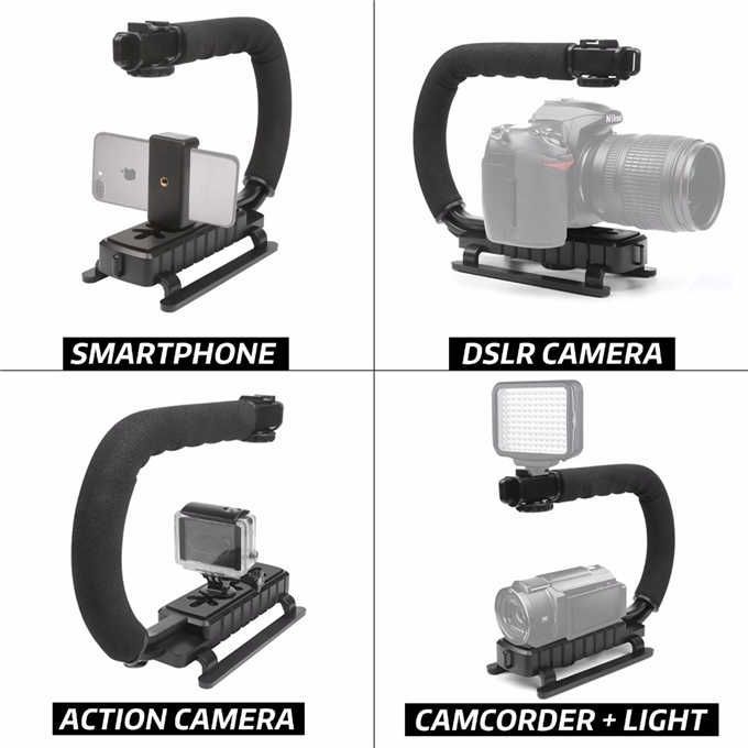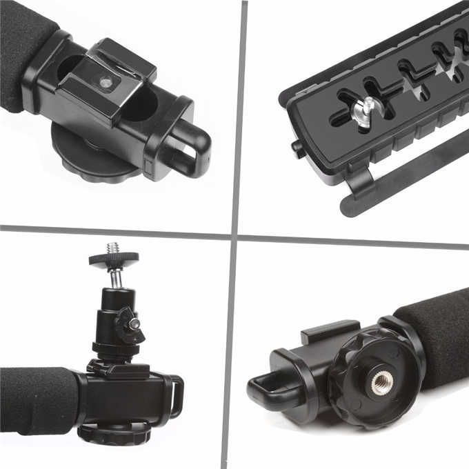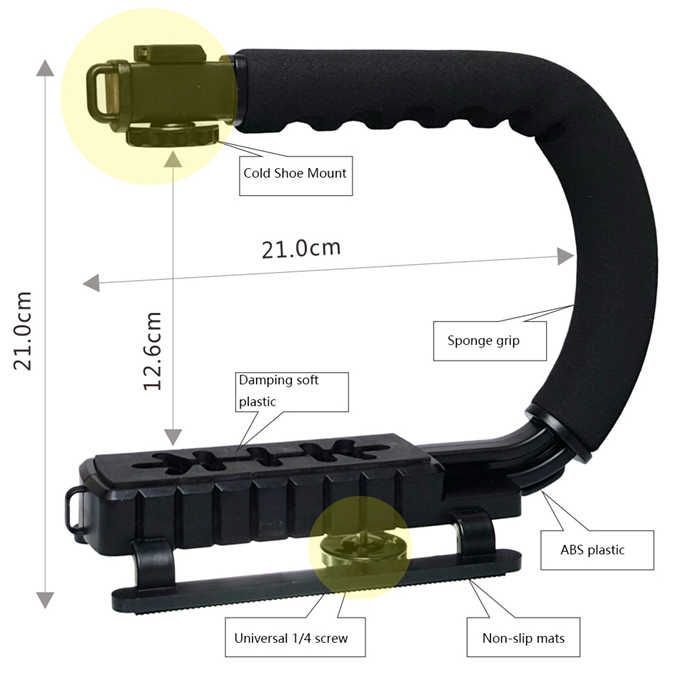 Detailed description1. Enhance stability of video filming.2. U Grip is an excellent design for multi-angle shooting.3. Equipped with a cold-shoe to mount microphone or video strobe light.4. Fit with a standard 1/4"" screw to lock the DSLR or camcorder.5. With 1/4"" threaded hole at the bottom to mount tripod or other devices.6. Supplied with anti-skid foot pad to be put on a platform.7. Soft foam grip adds comfort and eases the long shooting fatigue.8. Made of high quality ABS.
