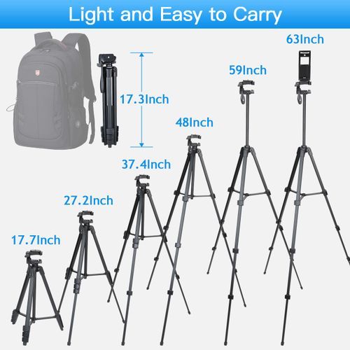 【60" Adjustable Height Phone Tripod】: This tripod has 3 adjustable quick leg locks and an extensible middle that can extend from 17 inches to up to 60 inches in height. The quick release plate has a 1/4" Screw which is suitable for most iPad/Cell Phone/DSLR Cameras. 【 Better Load Bearing & Compact Design 】: This camera tripod uses All-aluminum and high quality plastic floor MATS. Make this tripod sturdy enough! This tripod can withstand up to 8 pounds of preure. Besides, weight 730g/1.6 pounds and minimum size 17.3 inch makes it a portable and practical piece of equipment. 【2 in 1 Tripod Phone & Ipad Mount Holder 】:This Cell phone and Ipad holder can help you and save space for you when you need to use Phone and IPAD. This smart phone holder can stretch up to 3.5", which is suitable for iPhone 12/11/11 Pro/11 Pro Max/XS/XR/X/8/8 plus/Galaxy Note 9te 8/S10/S10 Plus/S10e. The iPad holder can stretch up to 7.7", which is Compatible for iPad Pro 9.7"/11", iPad Air/Air 2, iPad Mini, Galaxy, not including the IPAD 12.9"!