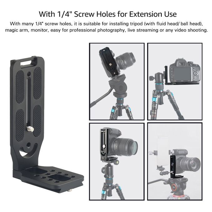 Many 1/4" screw holes of the quick release plate are suitable for installing fluid head, ball head, tripod, handheld gimbal, magic arm, panel light, field monitor and more photographic accessories, easy for professional photography, live streaming or any video shooting.