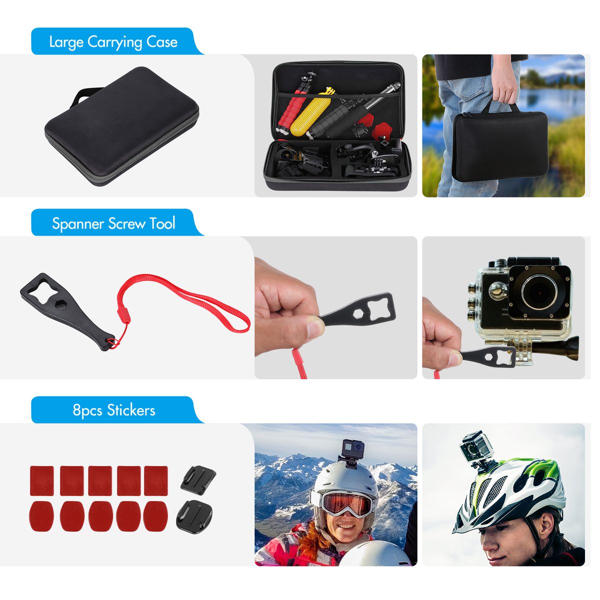 Features:【60-in-1 Universal Action Camera Accessories Kit】Compatible with most action camera on the market, this action camera accessories kit can help you to capture amazing moments and give your action camera the best protection, perfect for vlog, skiing, cycling, skateboarding and other outdoor activities.