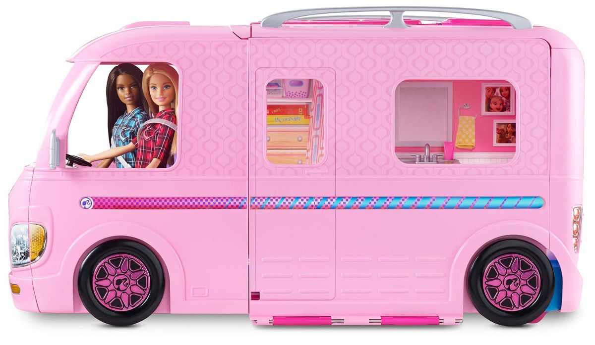 Transform the colorful Barbie DreamCamper into a campsite play set with the push of a button -the top pops up, the side pops out and the back expands to create a play space more than 2 feet long