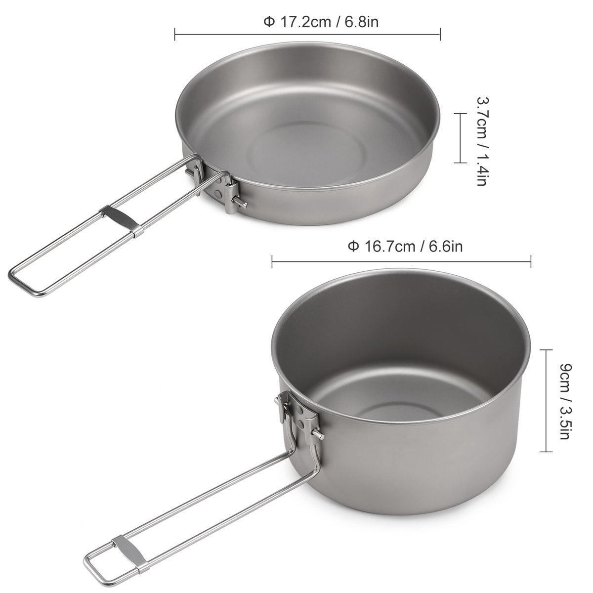 Pure titanium pot and frypan set with foldable handles, very suitable for camping, hiking, backpacking, and other outdoor activities.