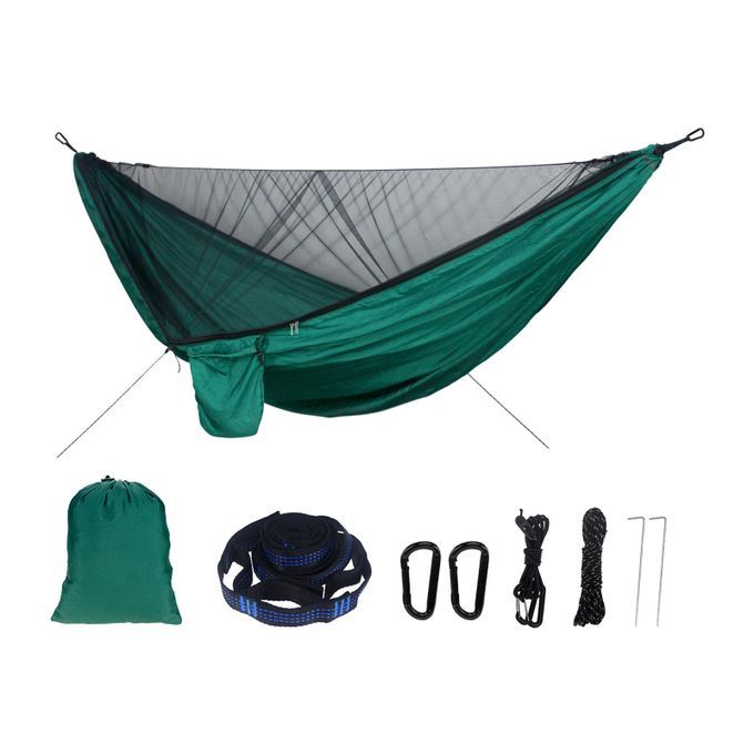 - Easy to Set Up Our Mosquito Nylon Hammok omes with 2*hammok straps, 2*arabiners and 2*6m ropes. You an just attah them to anything sturdy like trees, and its that fast to set up in just one minute. The mosquito net zipper is two-way, you an easily lose it even if you are inside the mosquito net.