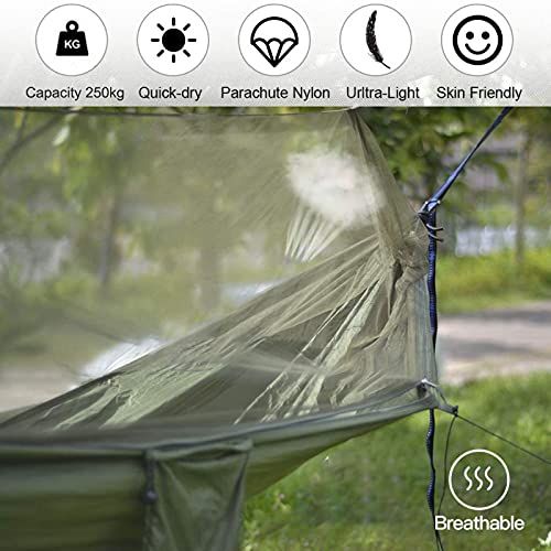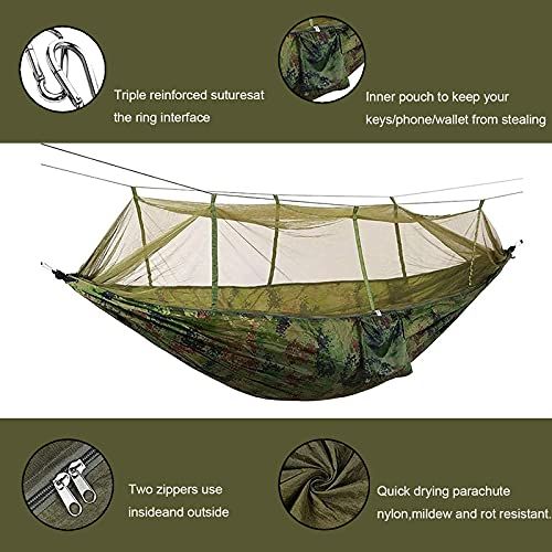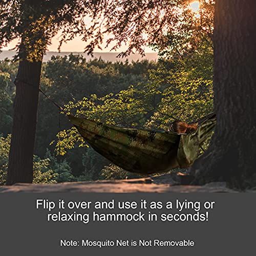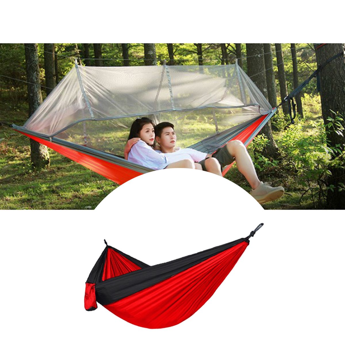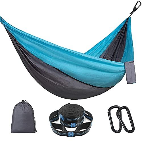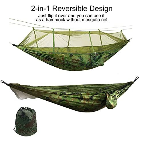 - Comfortable & Durable Lightweight Double Camping Hammok made of high quality 210T parahute nylon materials, skin-friendly and anti-tear fabri whih is the same kind skydivers use, support for 0 pounds. The hammok an be used by two people at the same time. Not only an the mosquito net be losed to prevent mosquitoes and fallen leaves, but it an also as used be opened and enjoy the senery.