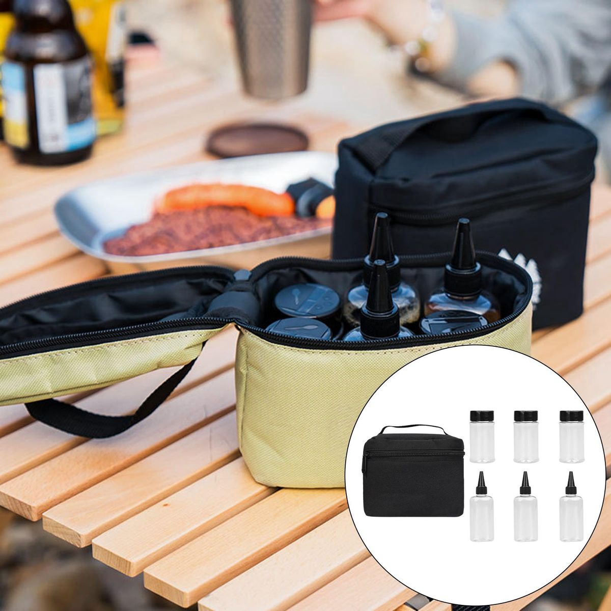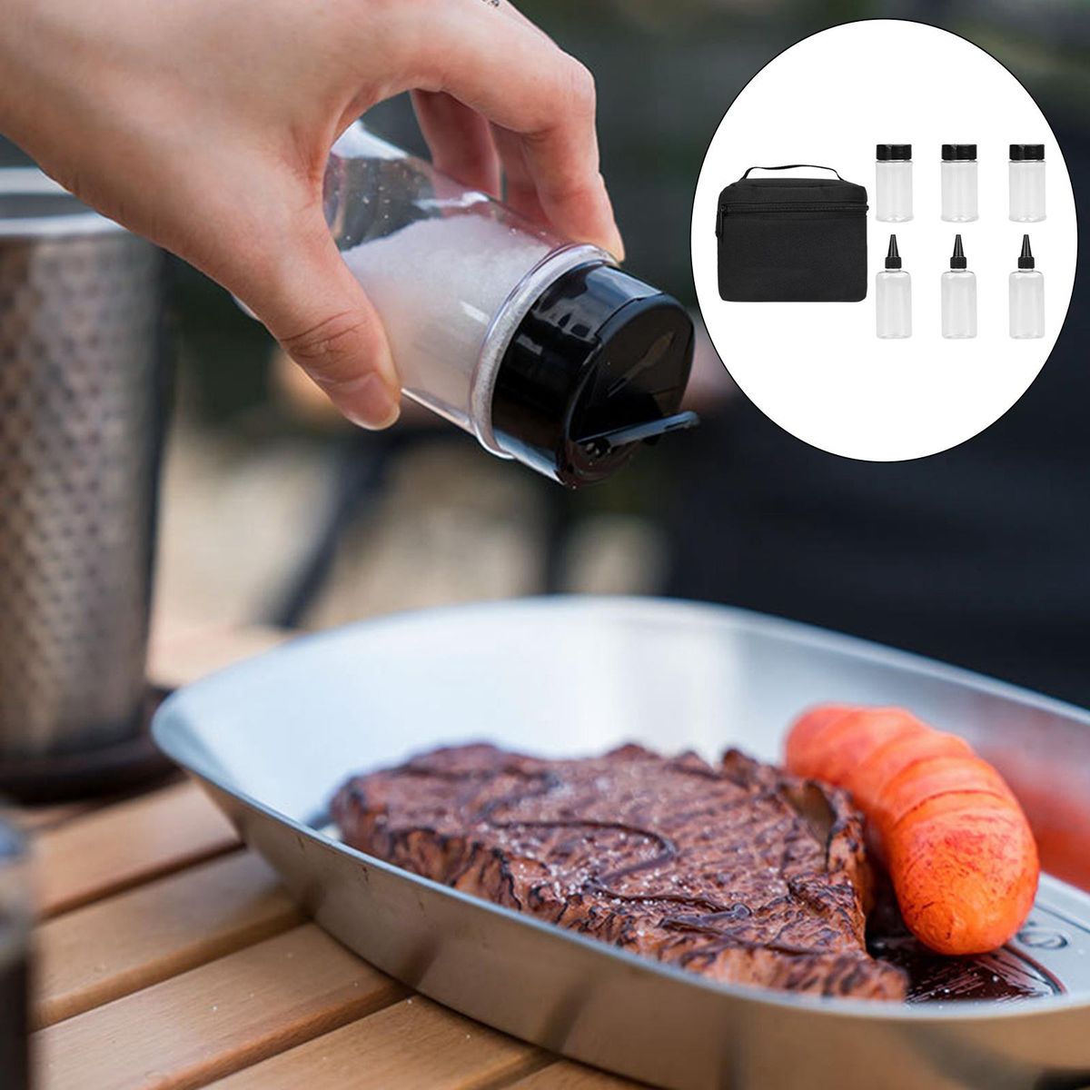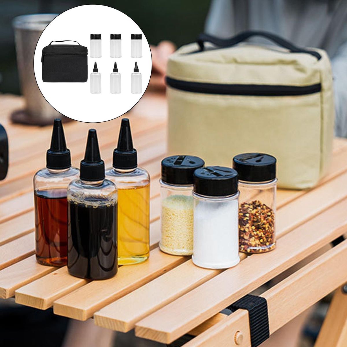: Made of PET ABS and Oxford Cloth, clear you easily identify contents .EASY ORGANIZATION: 6Pieces seasoning bottles, 100ml Sharp mouth bottle, 80ML round bottle 40ml, store oil, , , salt, sugar, cumin, pepper, dry herbs, etc .ADJUSTABLE LID: sharp mouth jar covers rotate to open and close, and allow you to control how much seasoning is dispersed, leaving minimal condiment supplies .LIGHTWEIGHT AND PORTABLE: Comes with carrying storage bags, to carry. Perfect for outdoor camping picnic .PERFECT FUNCTIONALS: good cooking helper, spice to your dish when camping, hav picnic or cooking at your house, can also storage for makeup cosmetics, for travelling .