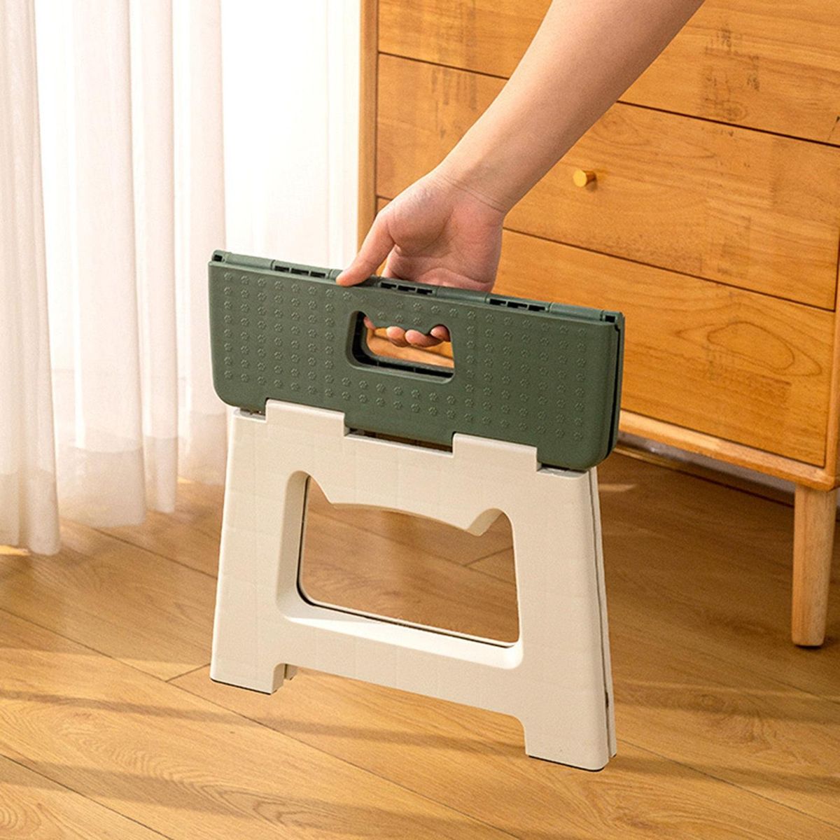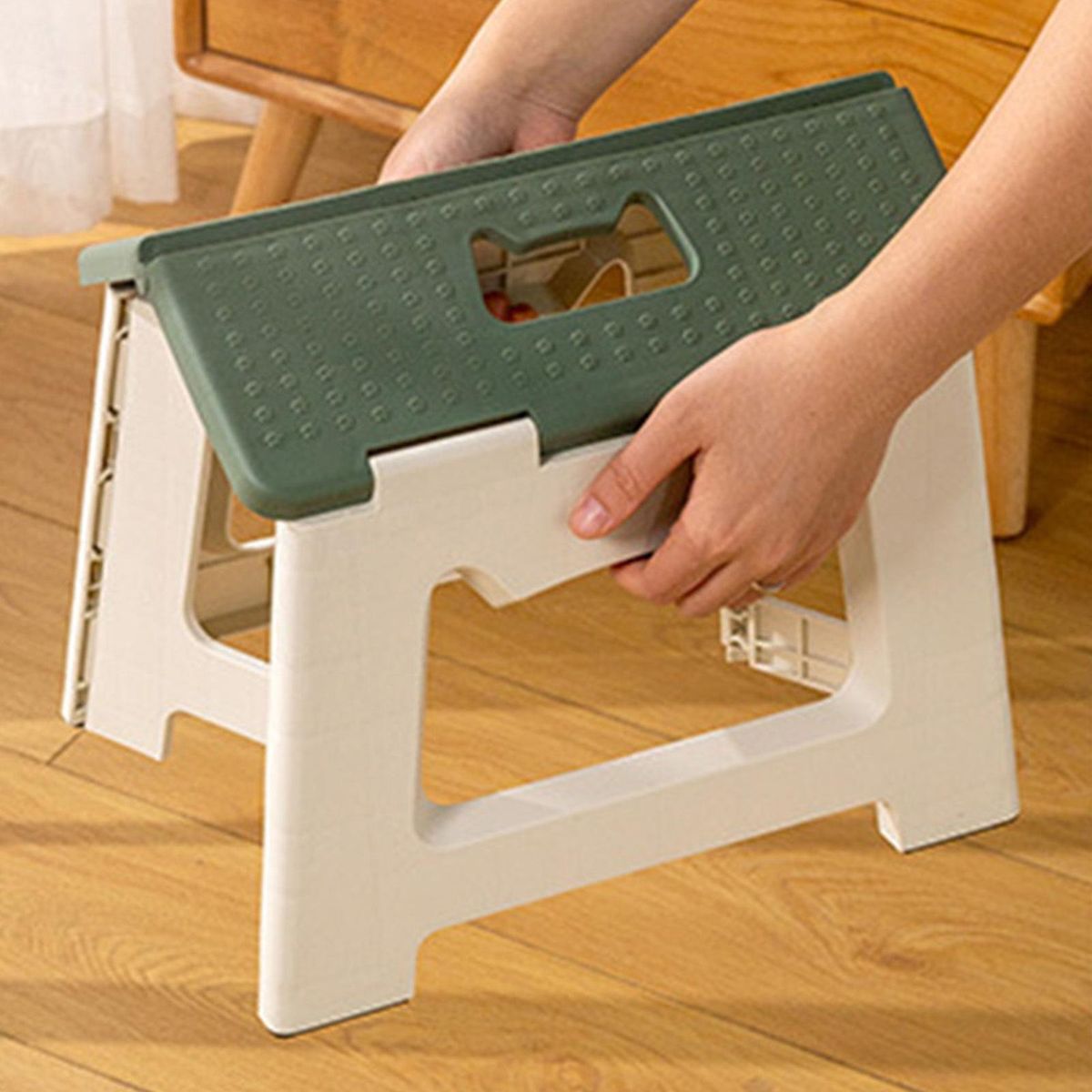 With cute cat carrying handle, this folding stool is small and cute; rounded corners make it silent and non-slip without hurting the floor, in addition, it is solid and sturdy with strong load-bearing capacity and high stability.