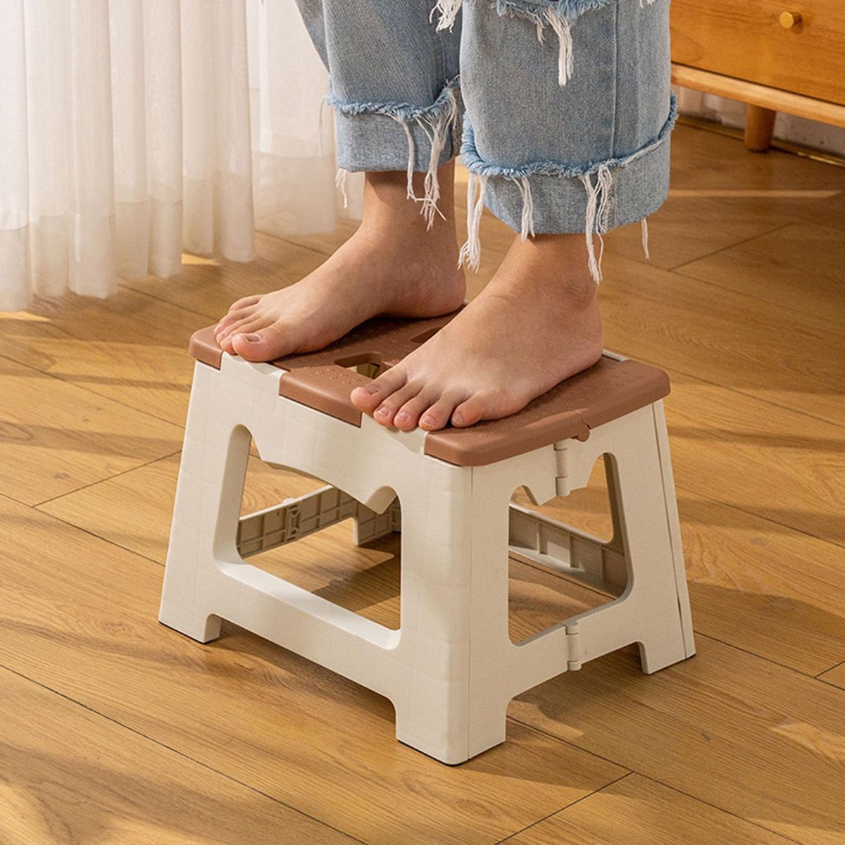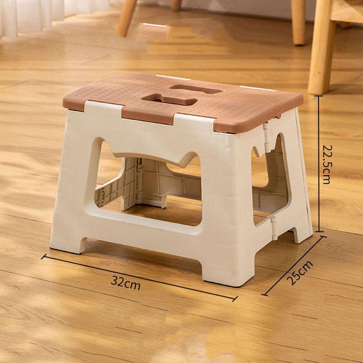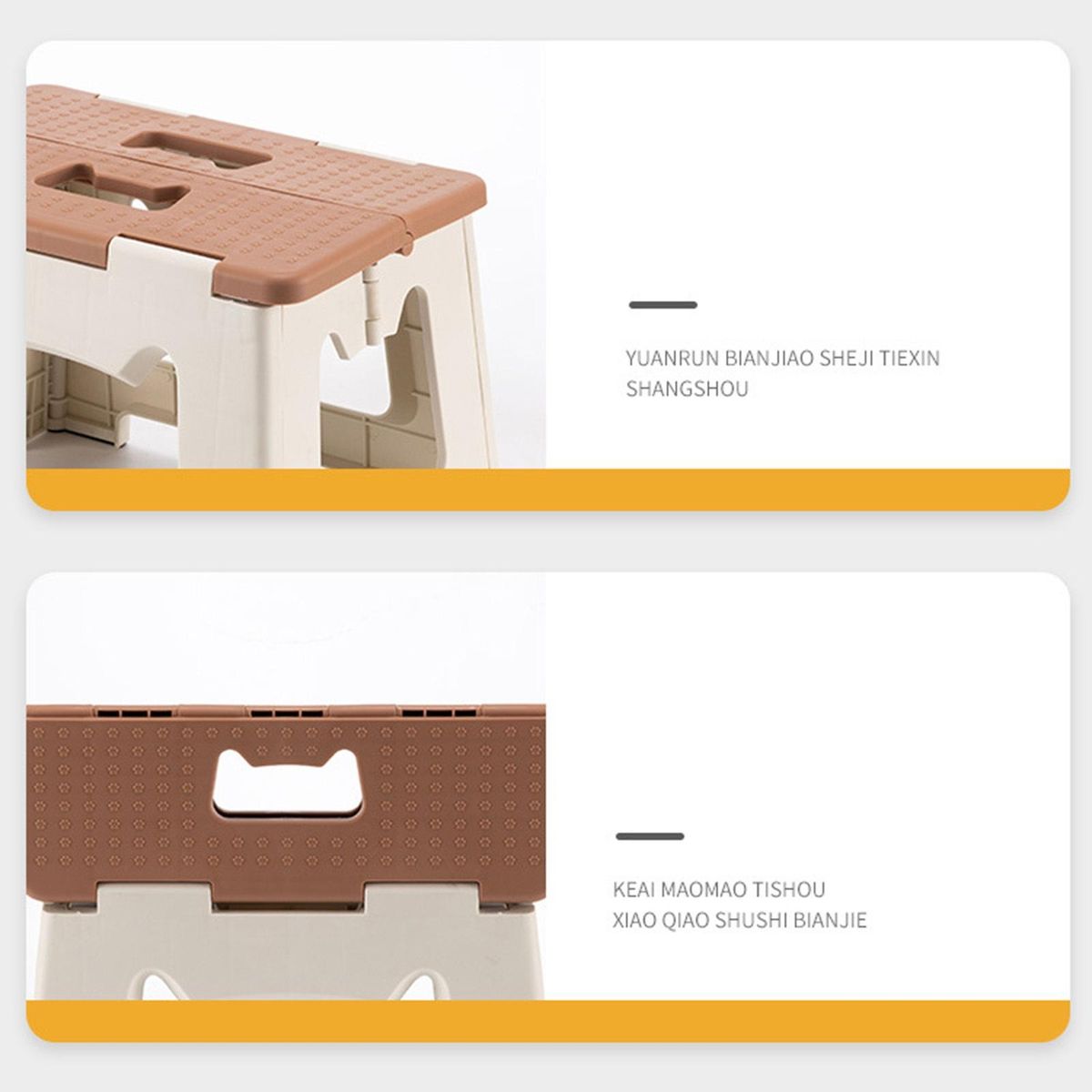 With cute cat carrying handle, this folding stool is small and cute; rounded corners make it silent and non-slip without hurting the floor, in addition, it is solid and sturdy with strong load-bearing capacity and high stability.