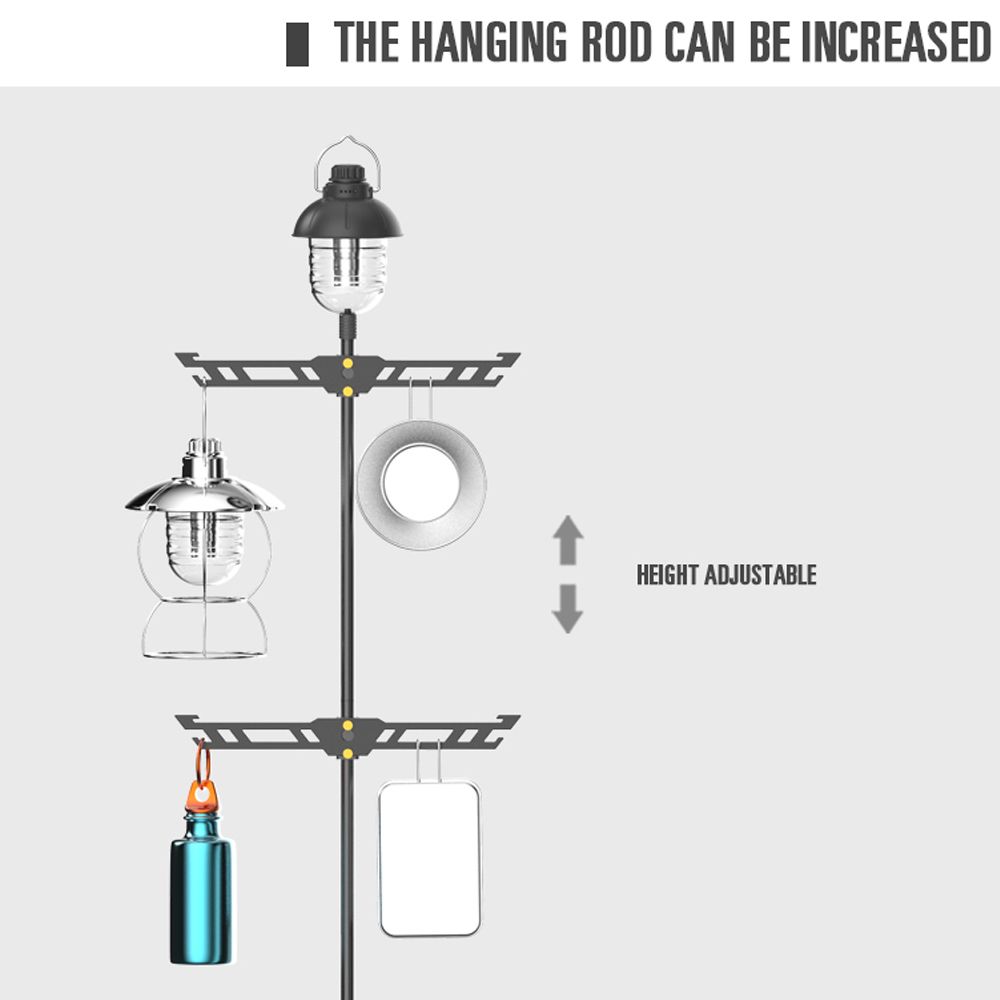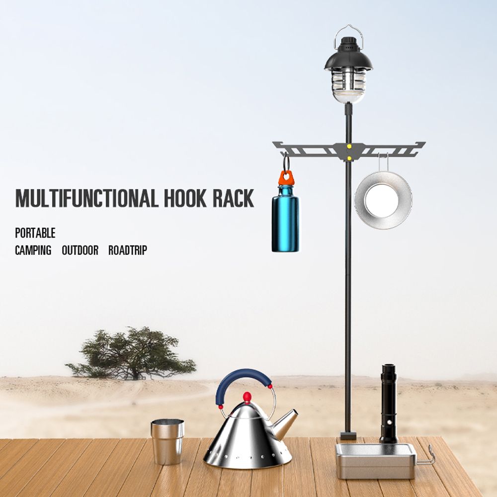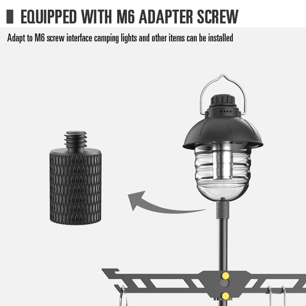 Outdoor multifunctional storage rack, with strong load-bearing capacity, can suspend cookware, bowls, cups, camping lights, etc. Equipped with an M6 adapter screw, you can install camping lights and other objects.