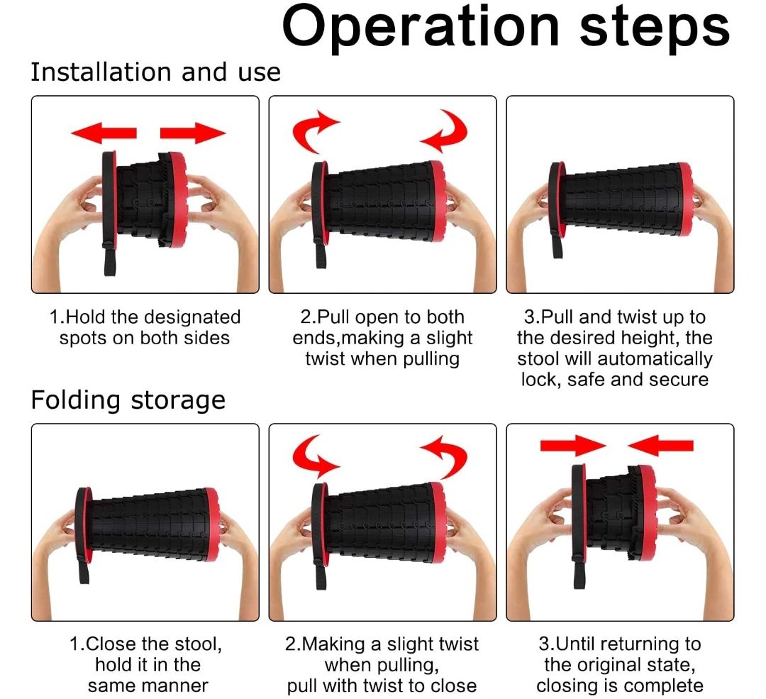 Camping Stool: Portable retractable camping stool, easy to carry, suitable for families to travel and camp;Portable Climbing Stool: Compared with other stools, it is smaller and more portable. It is definitely the best choice for mountaineering and hiking lovers!Safe and Stable Outdoor Stool: With a load capacity of 330 pounds, it is sturdy and stable, and can withstand collisions from the outside to a certain extent. You can bring it when you participate in outdoor activities.BBQ Party: Imagine how useful it is when you take it out at a barbecue or party.It's so cool!Travel: When you're tired outdoors, it's wonderful to open the telescopic stool and sit down and relax.Fishing: The telescopic stool can be adjusted to suit your height, and you can find the best posture when fishing.