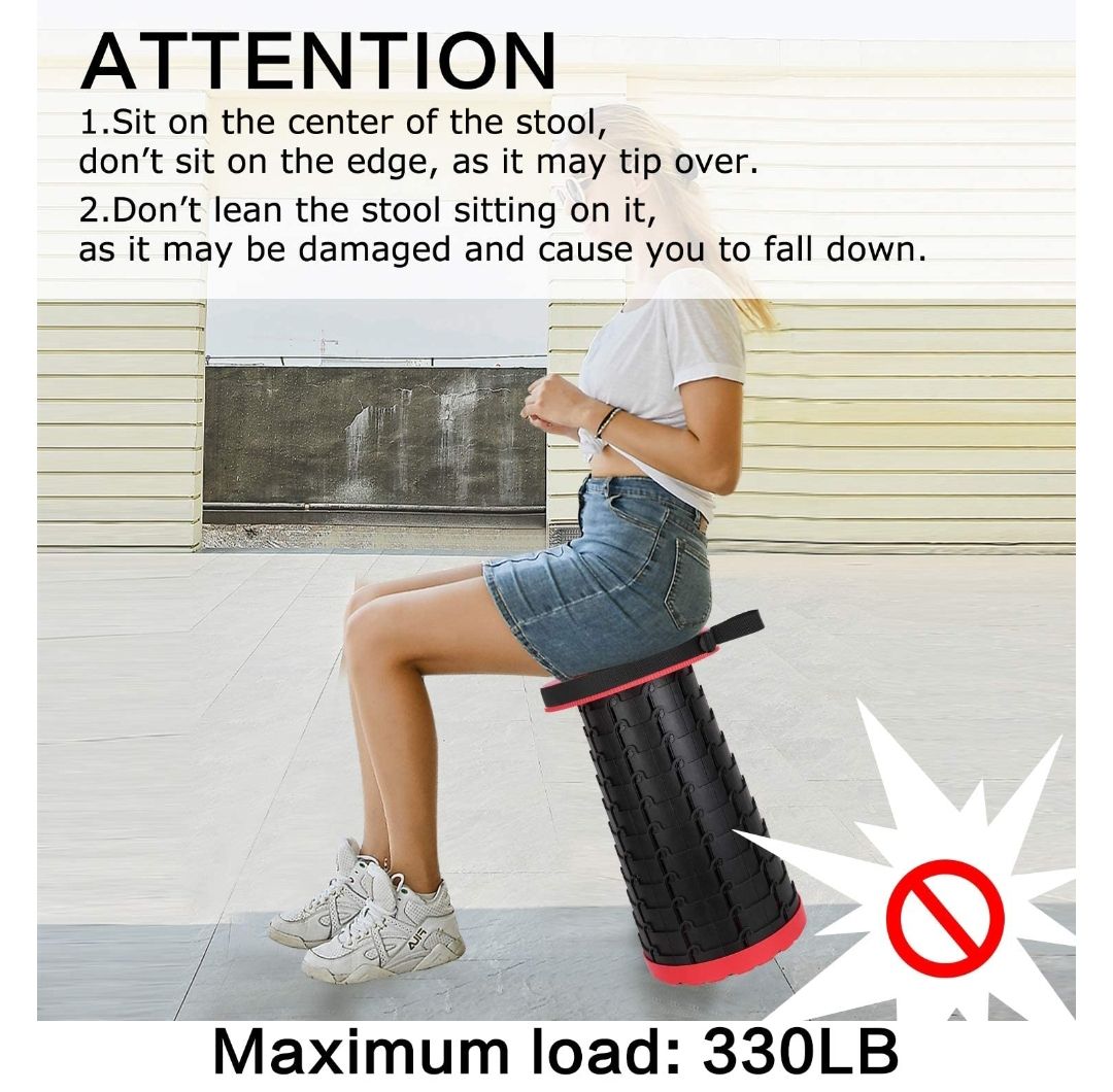 [ ANTI-SKID DESIGN] Equipped with height adjustment at the bottom, this folding camping stool is anti-skid and wear-resistant, which will be more stable even on the smooth ground. Buckle design is adopted between layers. The surrounded buckle can make the structure more sturdy for better use. The top of this portable telescopic stool is equipped with anti-skid frosted surface, comfortable and not easy to slide.[GREAT FOR THE WHOLE FAMILY]When deployed, you can customize our folding chair's height from 2.4” to 18”, making it an excellent family choice, fit for both adults and kids. NOTE: Please DO NOT sit on the edge of the seat and DO NOT tip the stool while sitting.[FOLDING, PORTABLE & COMPACT]Our portable telescopic stool can fit into any luggage, backpack, bag or car. Plus, the smart carrying strap allows you to easily carry our stool around much like a handbag.[STURDY AND DURABLE]Portable telescoping stool is crafted with premium polyamide, which is well-known for resistance and durability and can resist a variety of weather conditions. It is also regarded as an eco-friendly material. Equipped with scientific locking structure, rotating locking and buckle support, the scientific structure has superb load-bearing and can withstand 330 pounds.[FOR ALL-THINGS-OUTDOORS]Our retractable stool really shines when it comes to enjoying the Great Outdoors. Whether it's gatherings, camping, picnics, hiking, trekking,