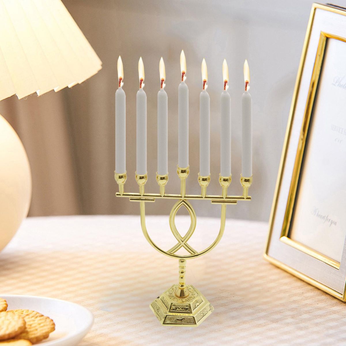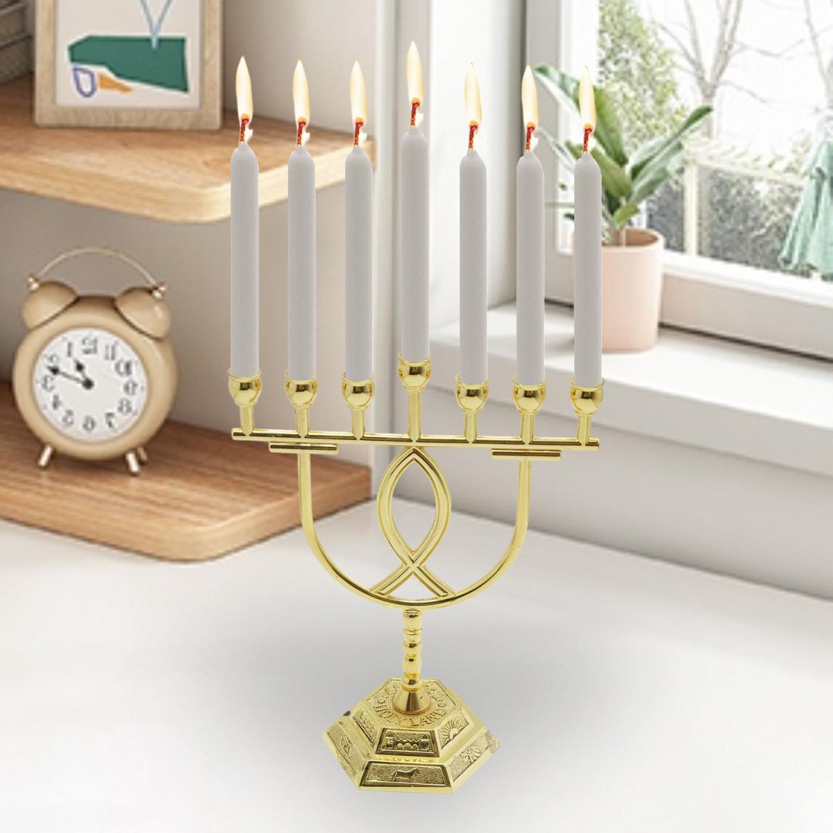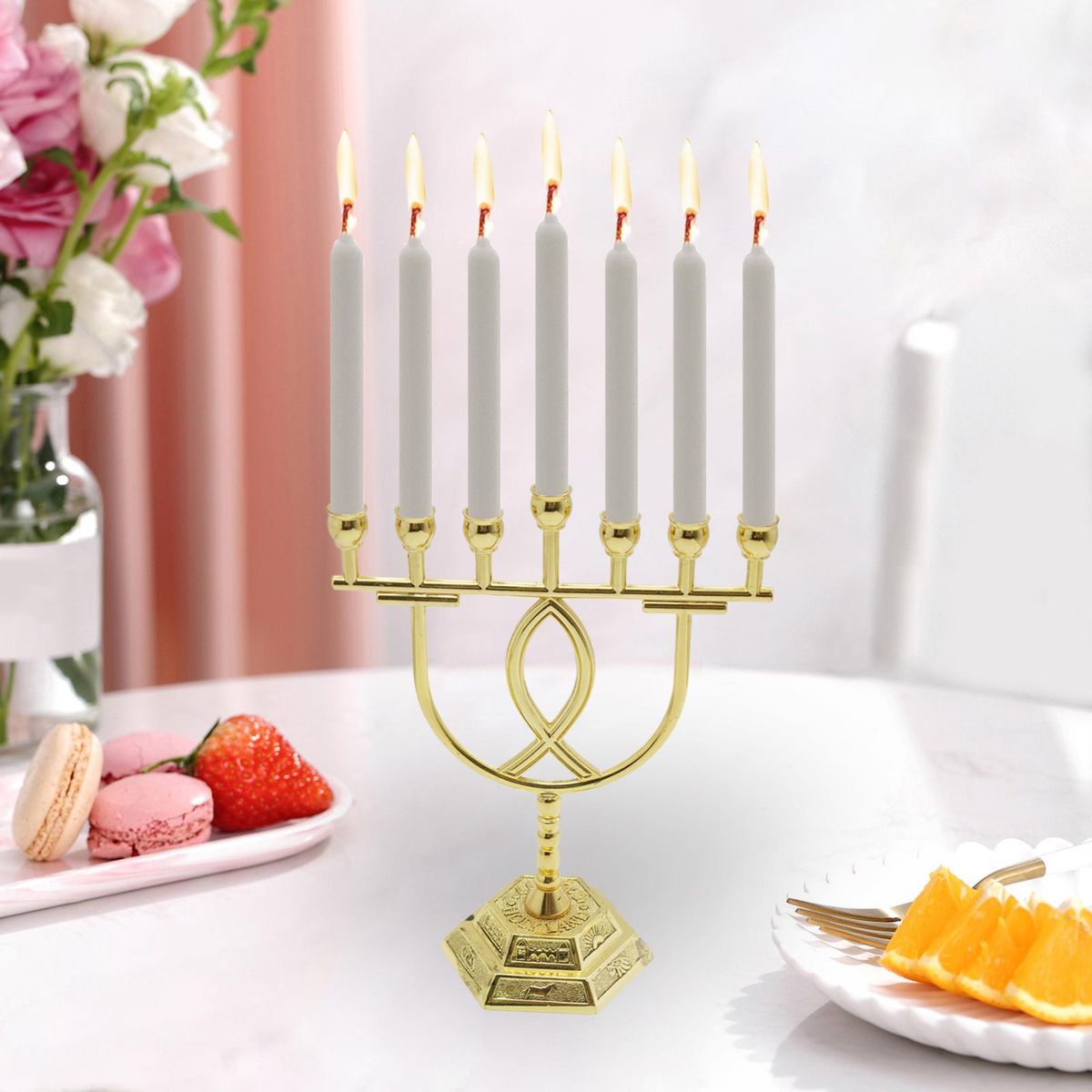 Traditional Hanukkah Menorah: Hanukkah candle holder is suitable for standard Hanukkah candles, beautiful and practical, with good texture.Quality Material: Hanukkah Menorah is made of high quality zinc alloy, with aureate plated, sturdy. Size(Height): about 17cm/6.7inch.Exquisite Craftsmanship: 7 Branch Menorah designed, the surface uses the electroplating process, and the long term use will not change color.Unique Hexagon Stable Base: The bottom of the candlestick holder is very flat, which can keep the candle stable.Occasions: Traditionally used for Hanukkah, but also perfect for Tabernacle, Shabbat, Christmas, etc. for bedroom, living room, and party.