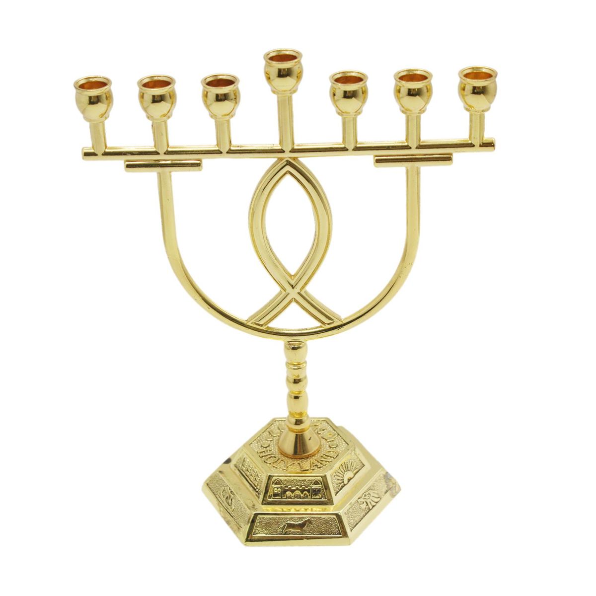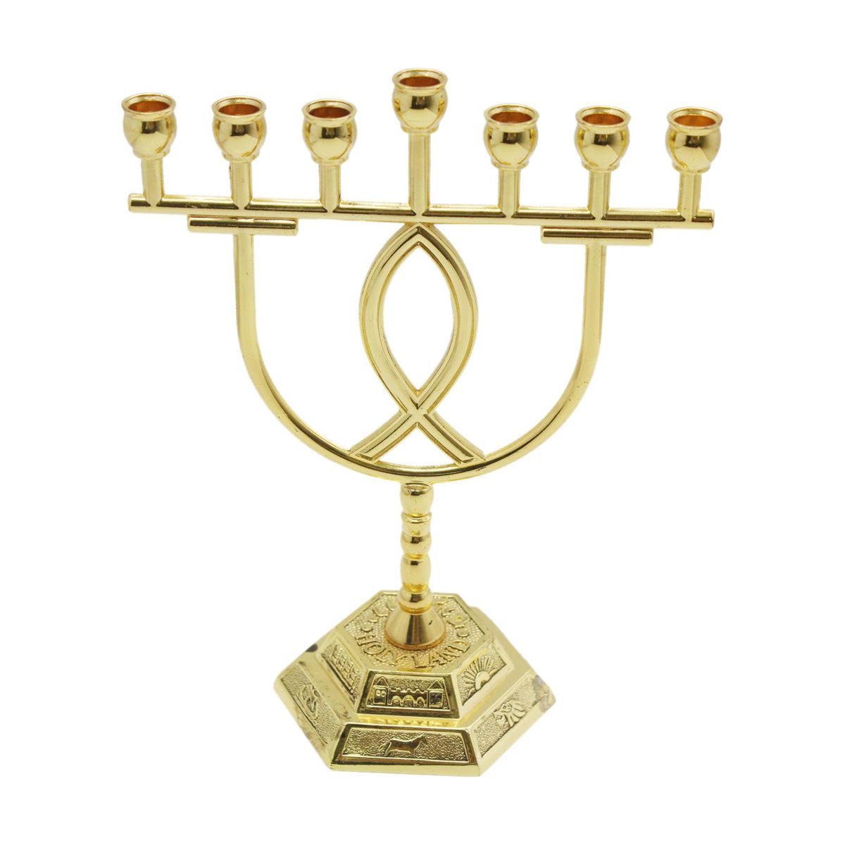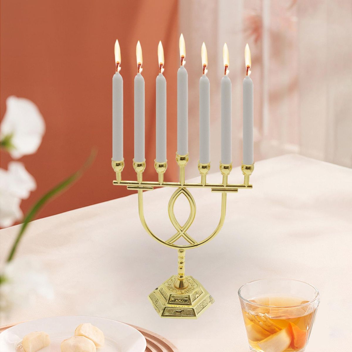 Traditional Hanukkah Menorah: Hanukkah candle holder is suitable for standard Hanukkah candles, beautiful and practical, with good texture.Quality Material: Hanukkah Menorah is made of high quality zinc alloy, with aureate plated, sturdy. Size(Height): about 17cm/6.7inch.Exquisite Craftsmanship: 7 Branch Menorah designed, the surface uses the electroplating process, and the long term use will not change color.Unique Hexagon Stable Base: The bottom of the candlestick holder is very flat, which can keep the candle stable.Occasions: Traditionally used for Hanukkah, but also perfect for Tabernacle, Shabbat, Christmas, etc. for bedroom, living room, and party.