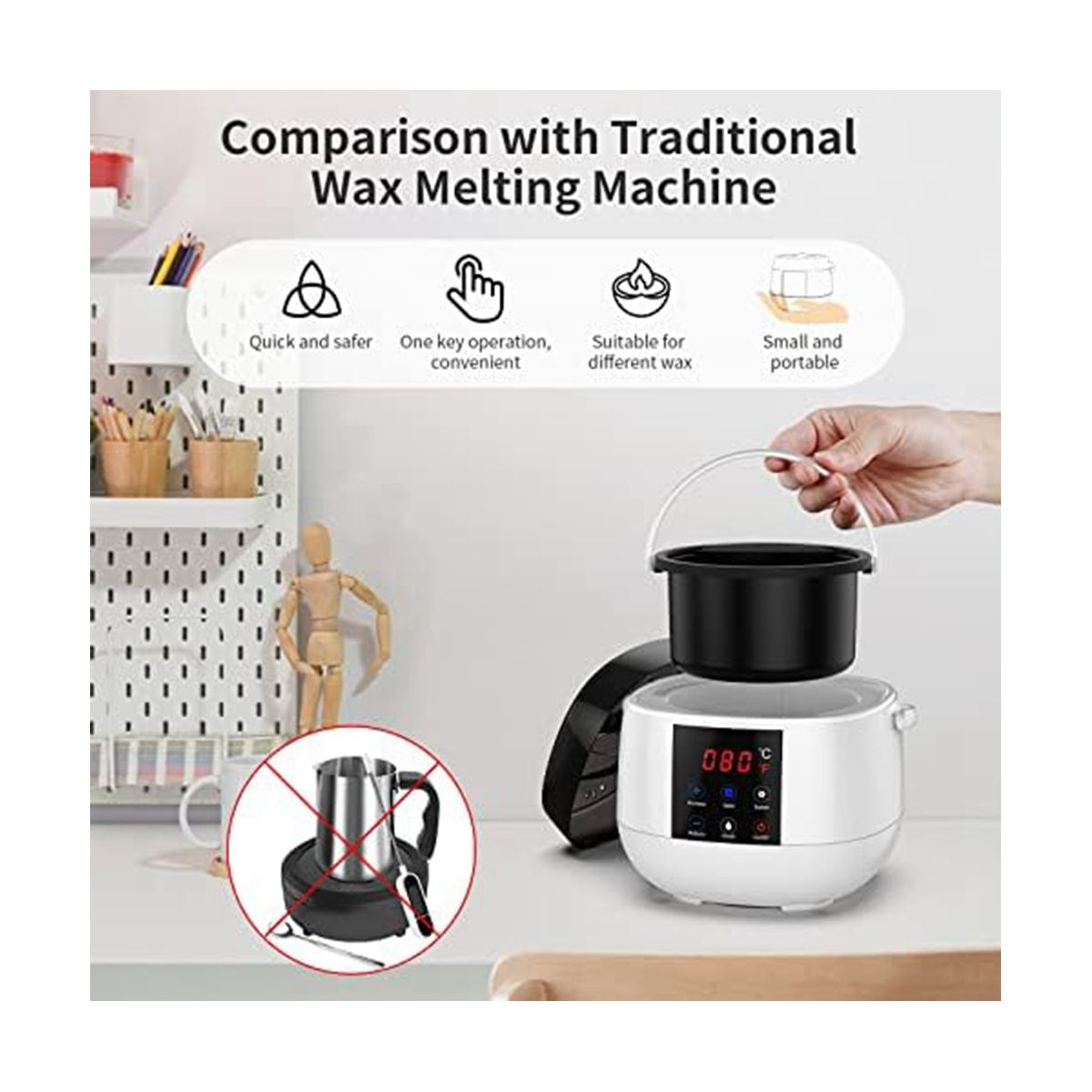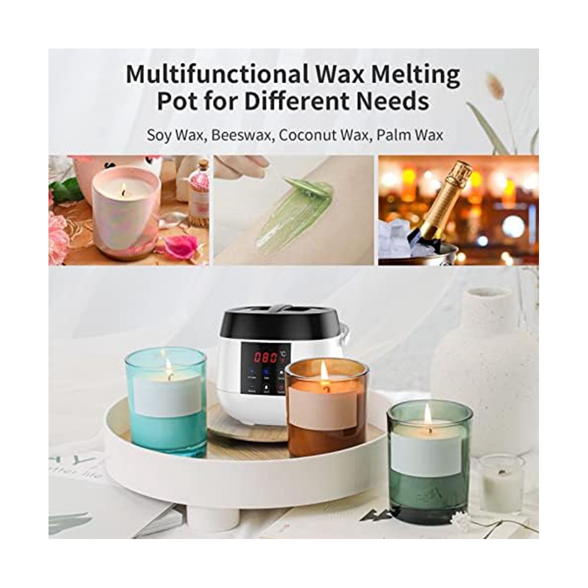 Candle wax melter holds 16 oz(500ml) solid soy wax, and as the wax melts, more soy wax can be added. In addition to soy wax, it can melt paraffin wax, coconut wax, . If the wax beans are not completely melted at the set temperature of 85℃, the wax machine will continue to heat to 120℃ to quickly melt the wax beans, and then the temperature 85℃. The removable non-stick candle melting pot is made of aluminum and , easy to clean (Note: Wax not included).