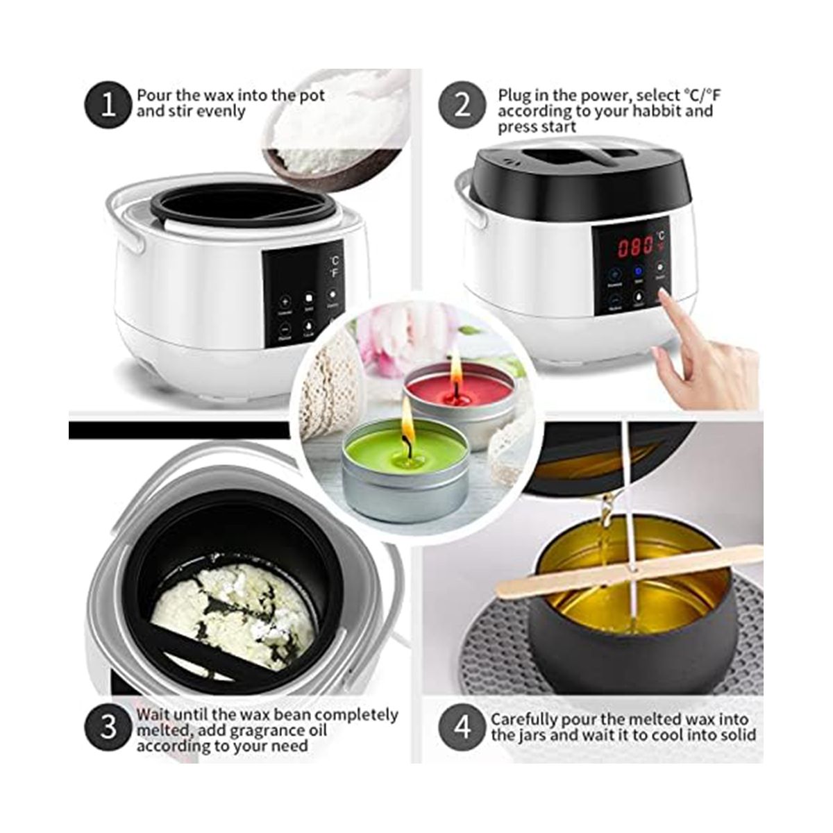 Put the wax into the melting pot, set the temperature, wait for the wax melting machine to heat the wax to a flowing state, and stir the wax with a spoon, then pour the melted wax into the jars and wait it to cool into solid. Package included: 1 x Candle Wax Melting Pot, 1 x AC Power Cord.