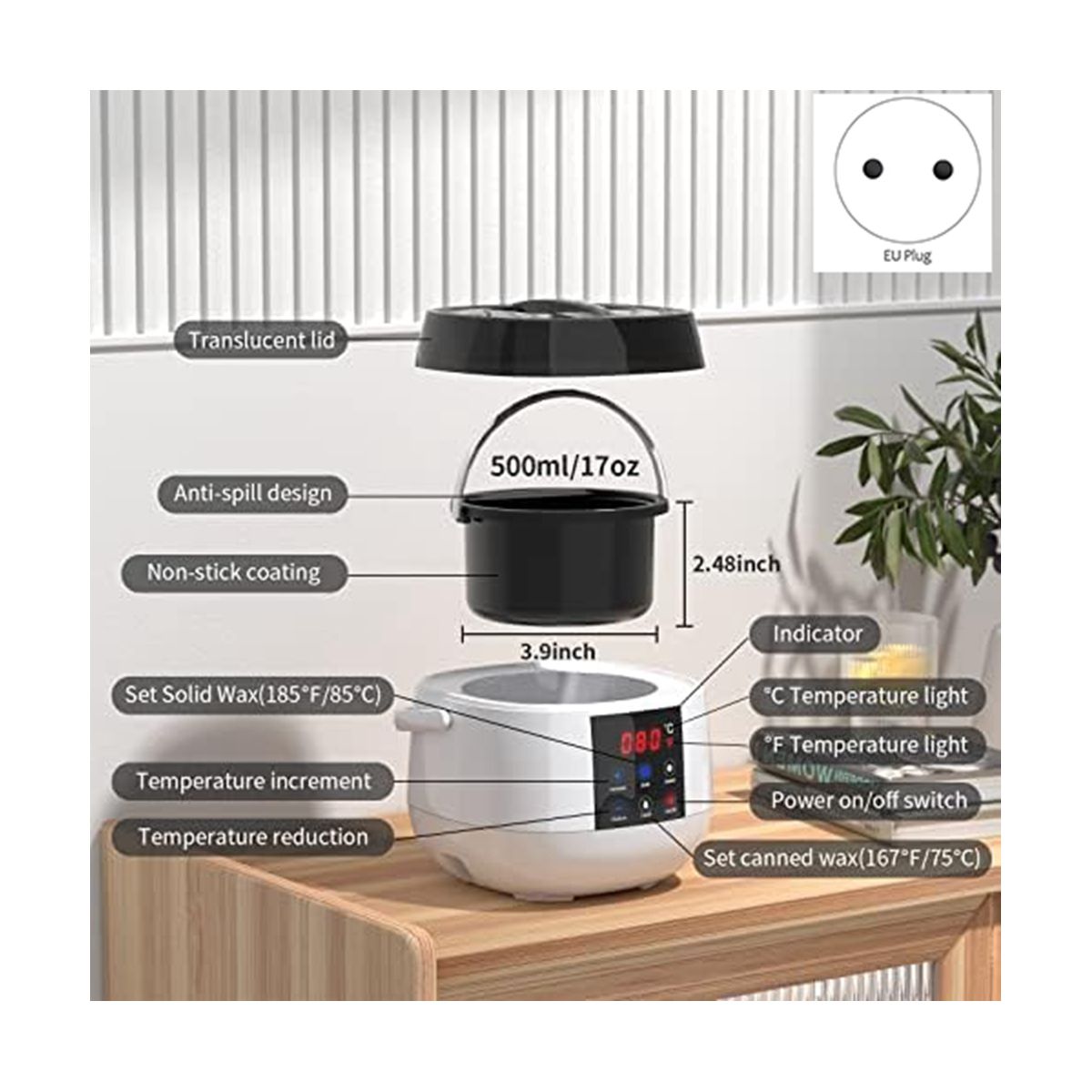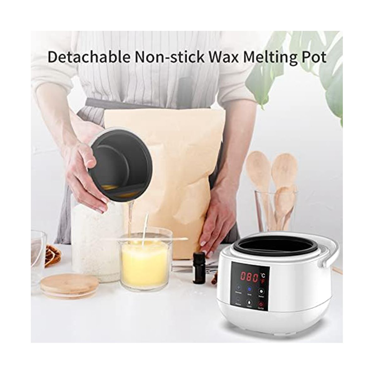 Candle wax melter holds 16 oz(500ml) solid soy wax, and as the wax melts, more soy wax can be added. In addition to soy wax, it can melt paraffin wax, coconut wax, ect. If the wax beans are not completely melted at the set temperature of 85℃, the wax machine will continue to heat to 120℃ to quickly melt the wax beans, and then the temperature drops tp 85℃. The removable non-stick candle melting pot is made of aluminum and PTFE, easy to clean (Note: Wax not included).