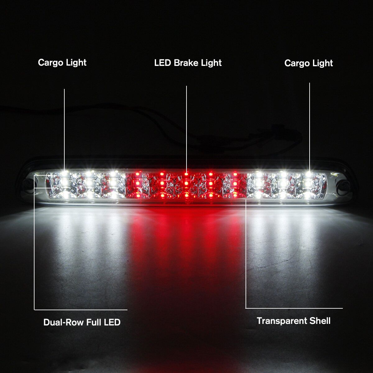 Our LED third brake light is a quick and easy way to dress up your pickup truck. When lit, the bright LEDs (Light Emitting Diodes) are illuminated, and shine up to ten times brighter than standard light bulbs. Even when the brake is not pressed, the integrated cargo light (if equipped) gives off plenty of white light to view your gear in the truck bed. The LED third brake light has a durable polycarbonate lens with free form reflector, and available with either the Clear lens