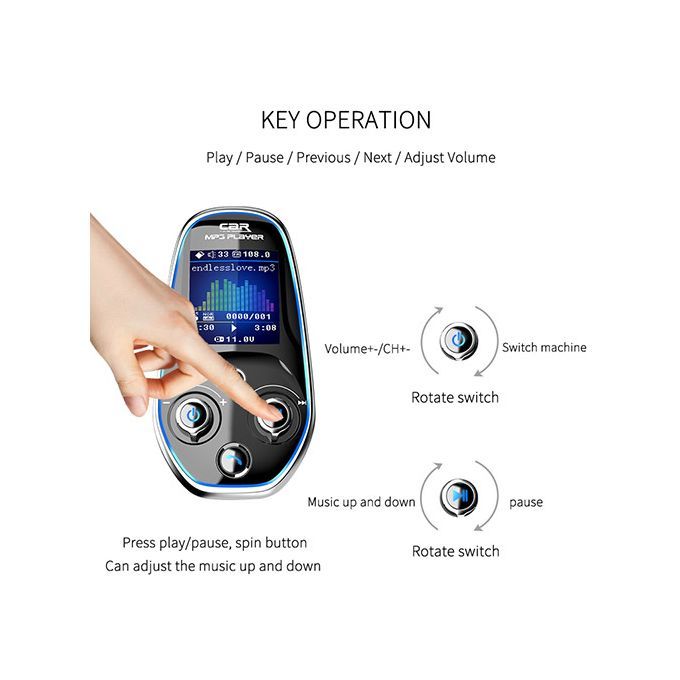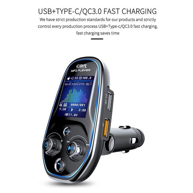 Features:1. Car Bluetooth 5.0 player2.AUX IN/OUT3.1.44 inch color screen4.QC 3.0+Type-C fast charge5. Multi-language6. Double knobs7. Bluetooth music8. Insert card MP39. U Disk MP3