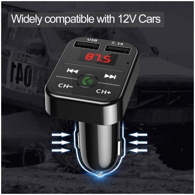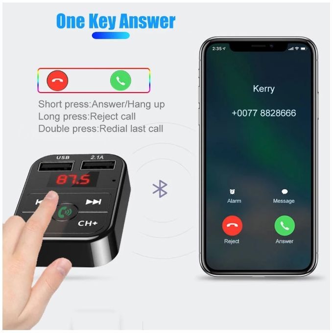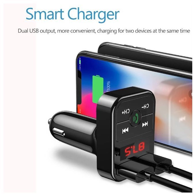 Features:Rated operating voltage: DC12V-24VWorking Voltage limits: 9-26VUSB1 Output: 5V/2.1AUSB2 Output: 5V/1.0A , read USB Flash music.Working Temp: 0-50Support Play format: MP3BT Version: Version 5.0+EDRBluetooth sound processing: A2DP(Advance Audio Distribution Profile)Bluetooth transmission distance: 10MBluetooth microphone effective range: 0.5-2MFM transmission frequency: 87.5-108MhzPackage included: 1 x Bluetooth Car MP3 Player(No Retail Box)How to use:1. Insert the device to car lig-hter outlet, start the car for Power ON;2. Tune the car radio and device to a same blank channel, such as if car radio is 87.5MHz, the device must be 87.5MHz to, press [CH] to adjust frequency;3. Turn on the Bluetooth of phone, search "BT-Car" and Pair with it, pair successfully, play phone music, sounds will comes out from car speakerTF/USB Flash Music playing: If insert the TF card or USB flash drive, it will automatically play USB music;Long press [Answer] button to swtich music mode between USB/TF/Bluetooth modes Bluetooth mode:Short press [Answer] button: Answer / Hang up call;Long press [Answer] button: Reject callDouble press [Answer] button: Redial last phone number