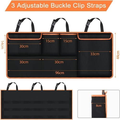 The car trunk storage bag is made of high-quality 600D Oxford cloth + environmentally friendly waterproof frosted PVC made. The mesh is strong, the needle thread is firm, and it can provide enough bearing capacity. It has the characteristics of dustproof, mildewproof, washable, not easy to tear, and easy to clean. It can protect your upholstery from scratches and dirt. And easy to clean those dirty shoe prints on the product. The storage bag has 6 pockets and spaces for storing things and keeping them organized. You can use the trunk storage bag to store travel supplies, baby toys, tire measuring instruments, pet supplies, tools, sports equipment, etc., which can be used for almost all long-distance trips and daily necessities. It is an ideal choice for car classification. Car trunk bag with 3 adjustment straps to ensure that the hanging trunk storage bag can support more weight. The 4 hook-and-loop closure design on the back fits closely with the seat. They can be installed and removed in a few seconds. There is no need to drill or paste to ensure that the car seat organizer is connected to the seat and will not damage the car itself.