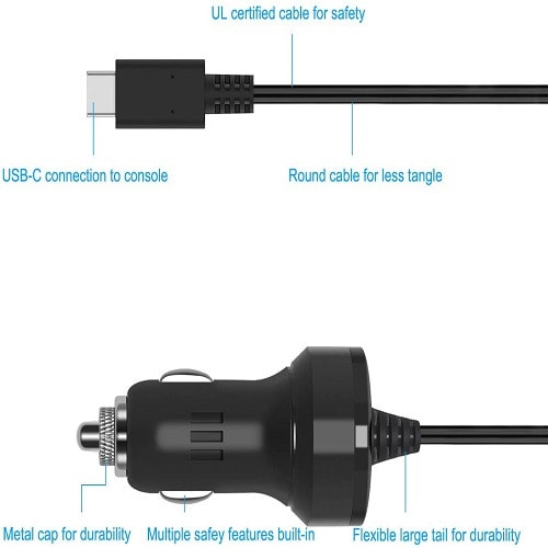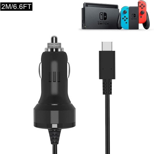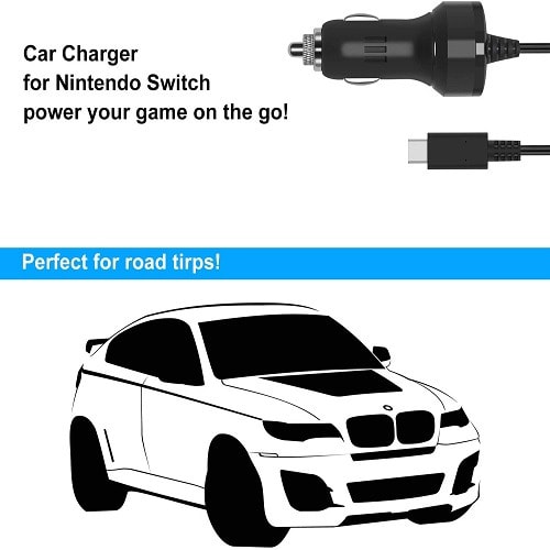 Car charger for Switch -Length:8 FT -USB-C connection to console -high-speed charging -Tangle-free flat cable -Power surge protection -Built-in Micro USB cable.Simple,small and elegant design. -Environmental ABS material,super-compact form factor -Protection against over-heat,over-current
