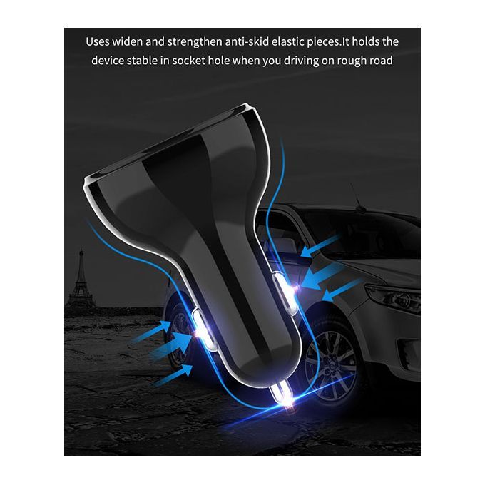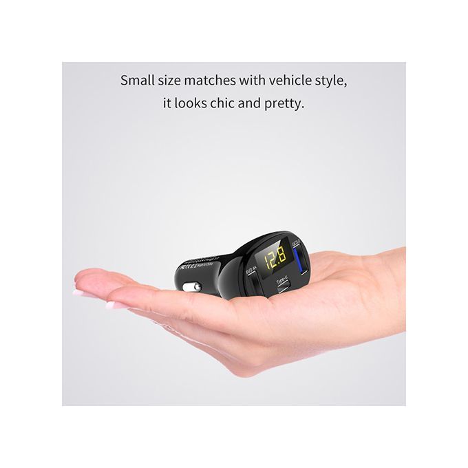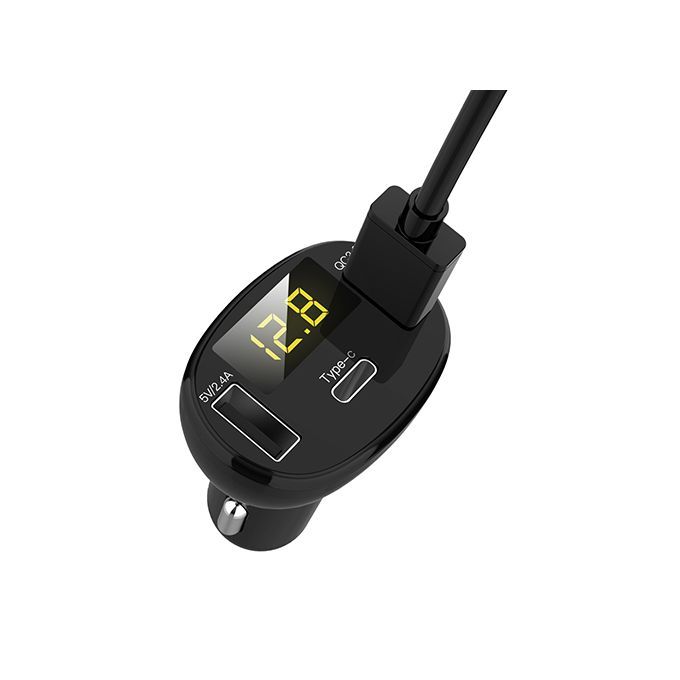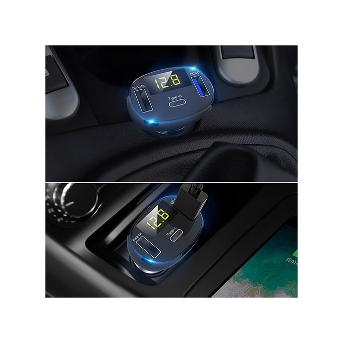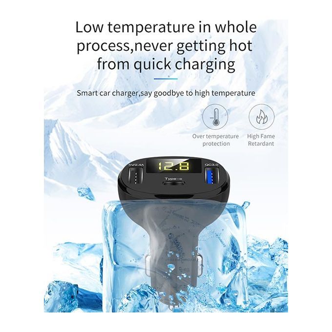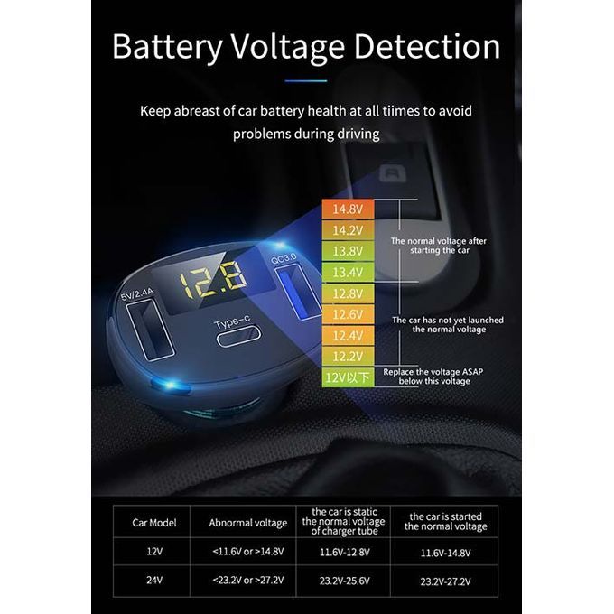 Features:1. Input voltage : DC 12-24V2. 0utput power: 5V DC/2.4A + QC3.0 + TYPE C 3.USB charging cable is needed (not included)3. Automatically detect the car batter y voltage and display it on screen4. Intelligent current input by adjusting and sharing the chargingcurrent automatically5.With cute size and nice design